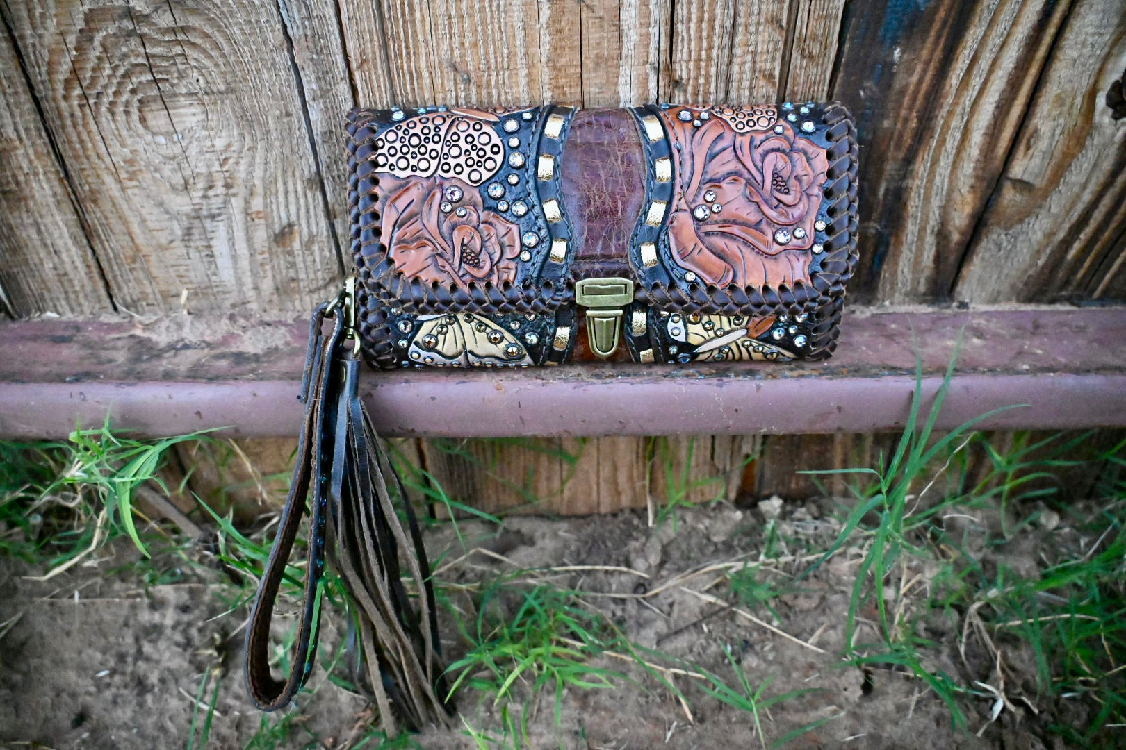 has the upgraded fringe wristlet strap, 12” rhinestone fringe on wallet and Authentic Zebra