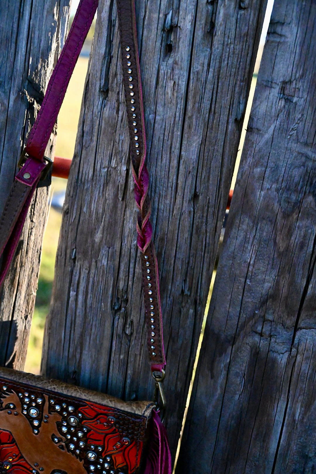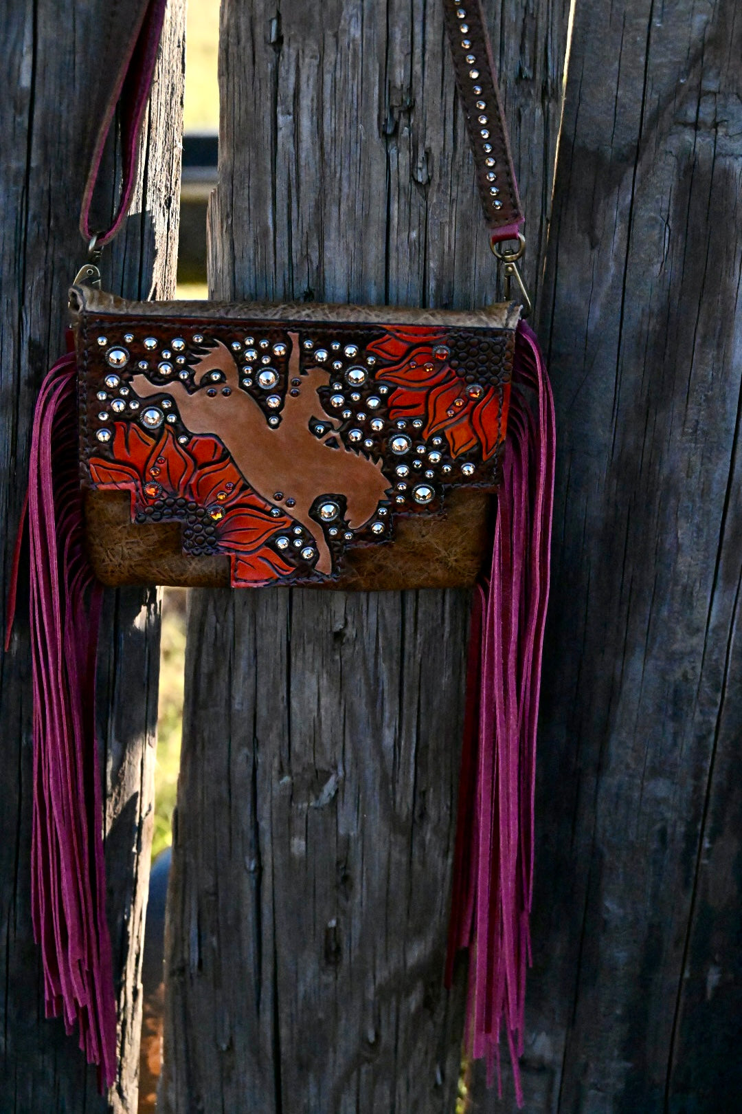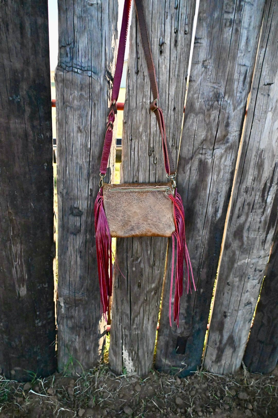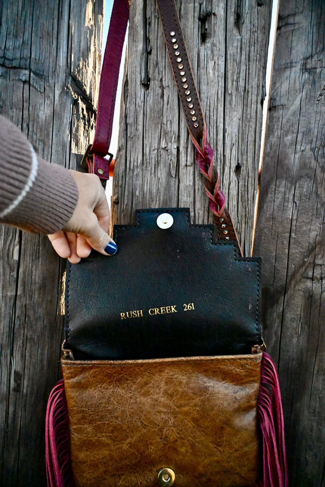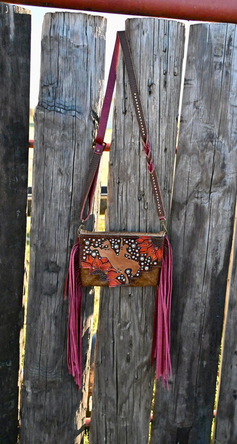 The Faith bag measures appxroimatelt 8”x6” and has a magnetic flap. There is a zipping pocket on the back and inside. The interior is lined with vinyl and it comes with an adjustable crossbody strap. Fringe is 14” long