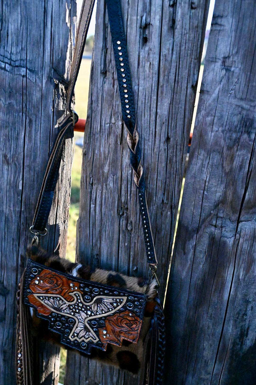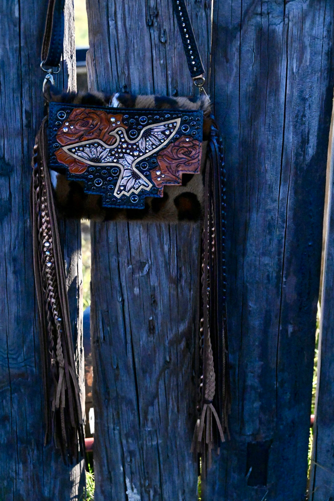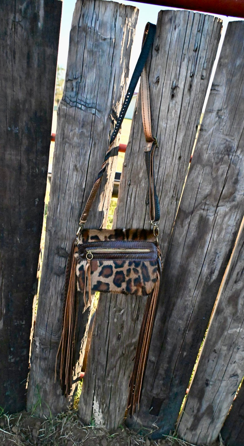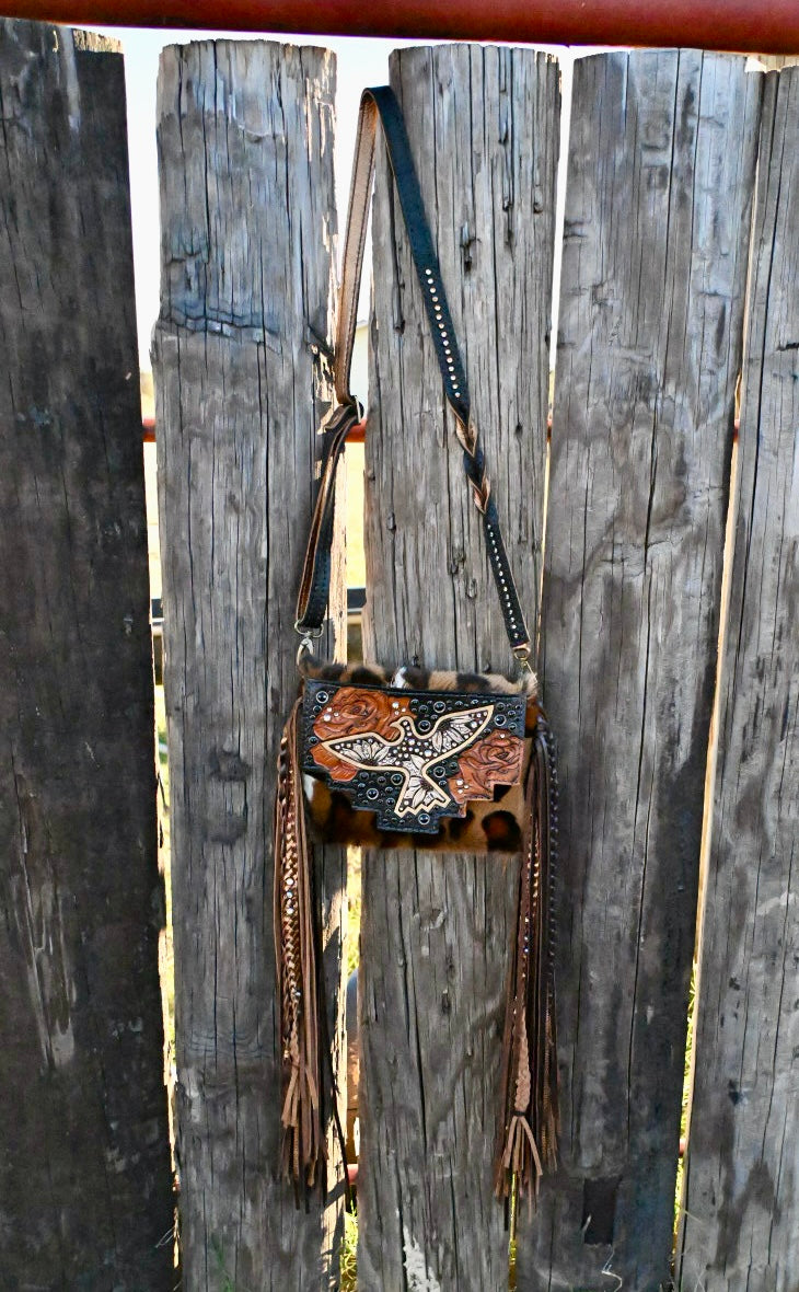 The Faith bag measures appxroimatelt 8”x6” and has a magnetic flap. There is a zipping pocket on the back and inside. The interior is lined with vinyl and it comes with an adjustable crossbody strap. Fringe is 14” long