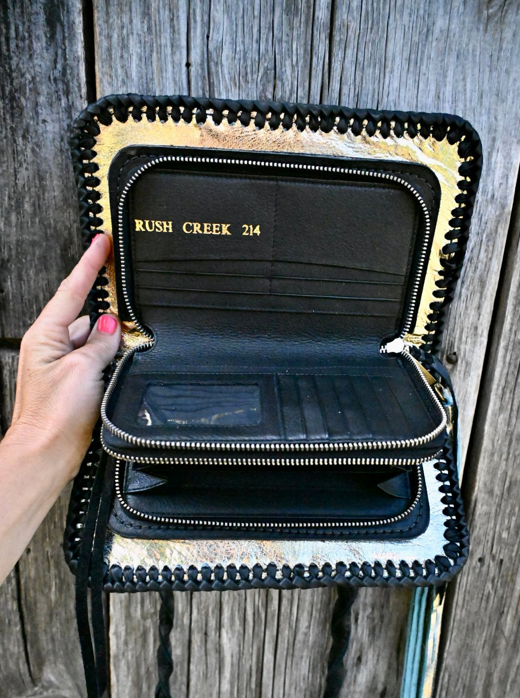 The interior has 2 large zipping compartments with several card slots and a zipping coin pocket the inside does fit check books and most cell phones