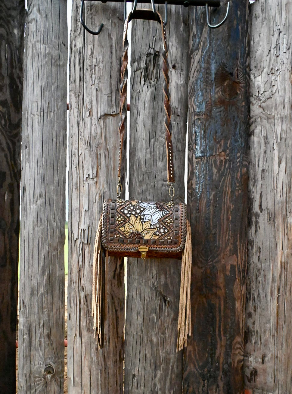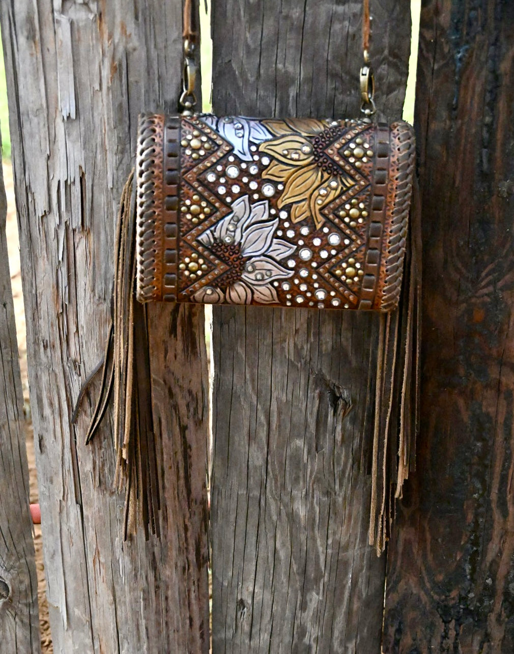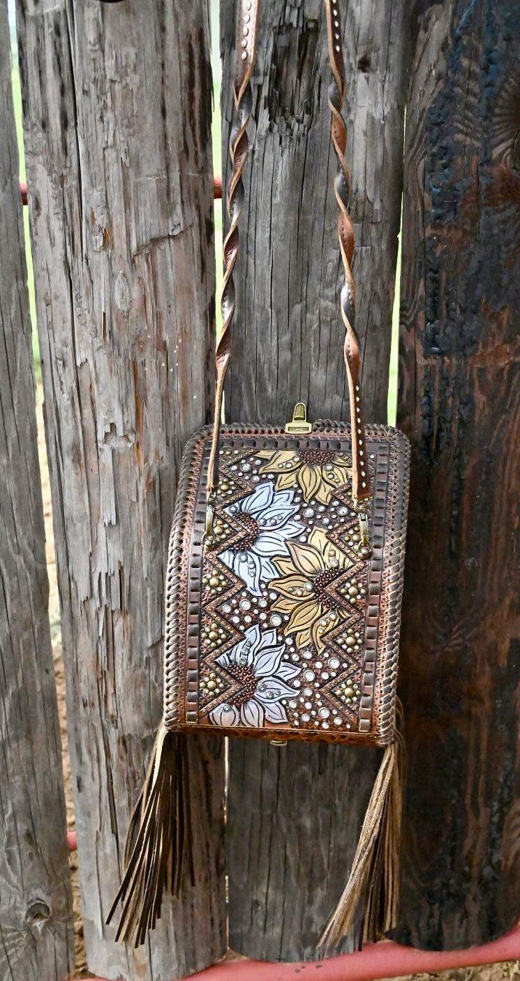 The most organized crossbody you could ever have. Upon opening the flap you have access to 10 card pockets, 3 horizontal pockets, and a pen loop. Then there is a large zipping pocket that includes a horizontal pocket, a gusset zipping coin pouch, a chap stick pocket, a removable key fob, and ample room for a cell phone and a few other small accessories. This bag has 12” fringe.