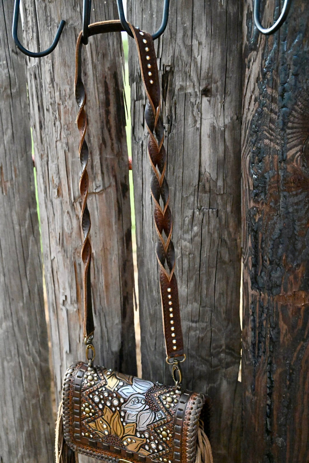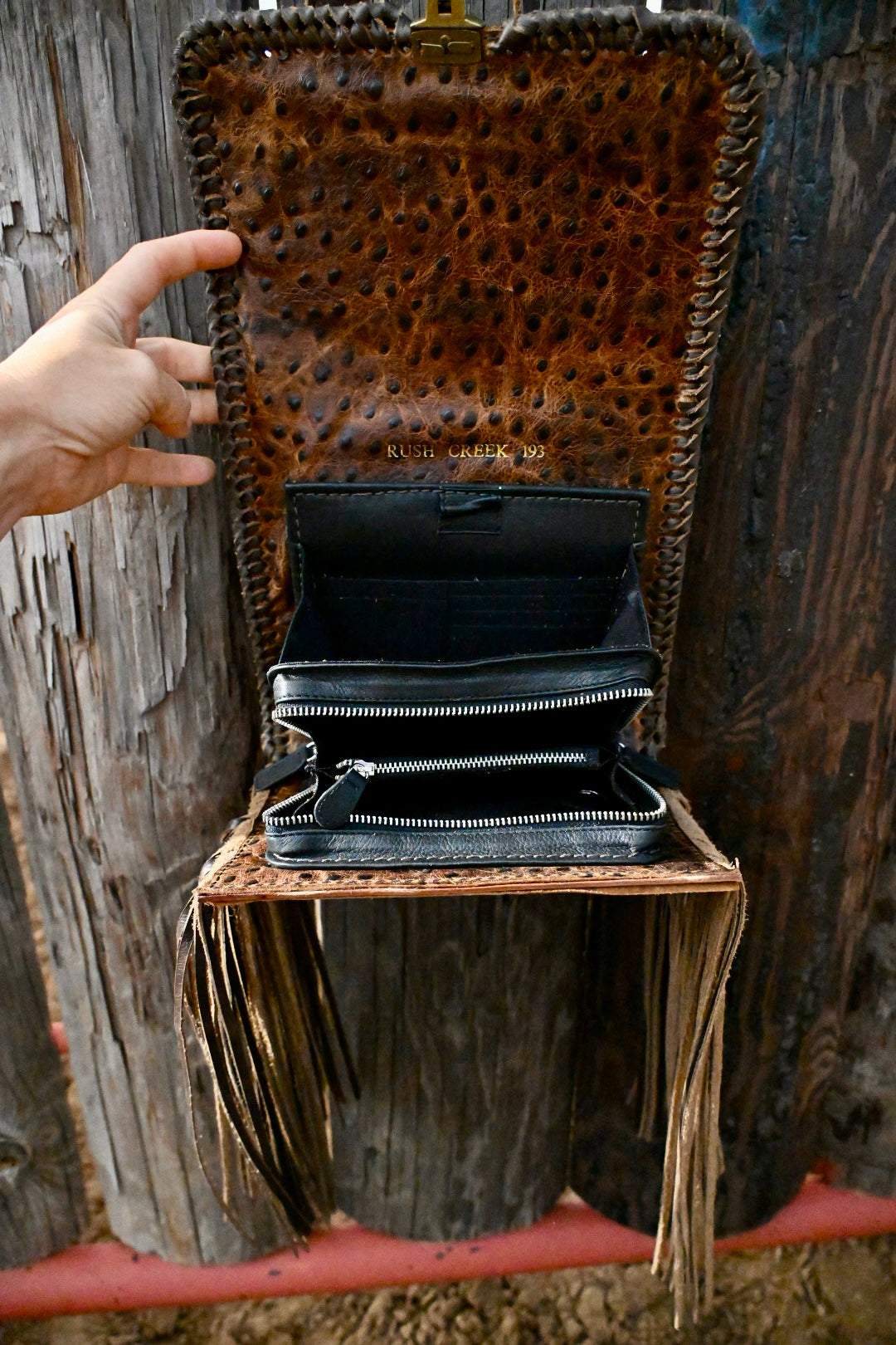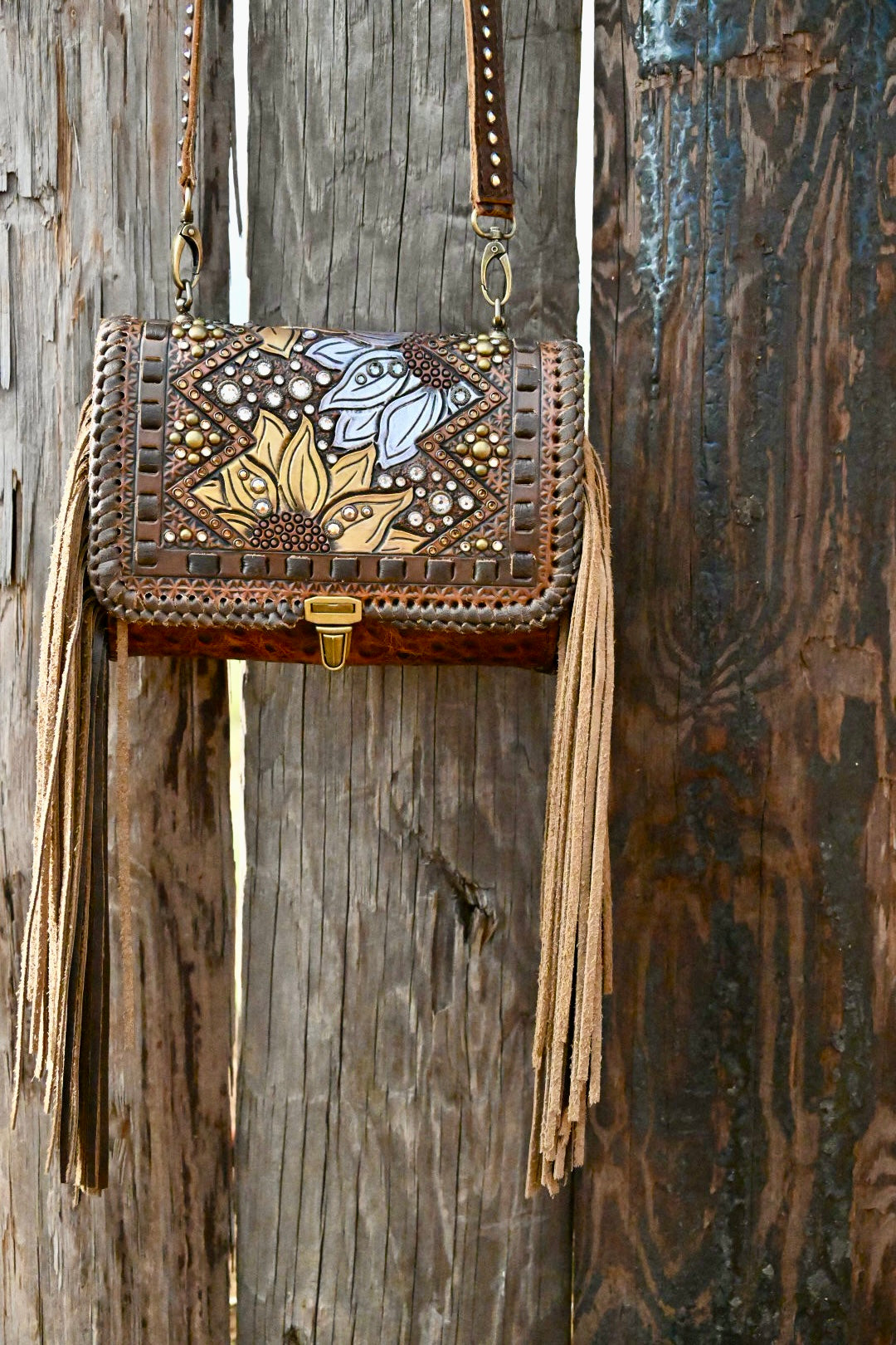 The most organized crossbody you could ever have. Upon opening the flap you have access to 10 card pockets, 3 horizontal pockets, and a pen loop. Then there is a large zipping pocket that includes a horizontal pocket, a gusset zipping coin pouch, a chap stick pocket, a removable key fob, and ample room for a cell phone and a few other small accessories. This bag has 12” fringe.