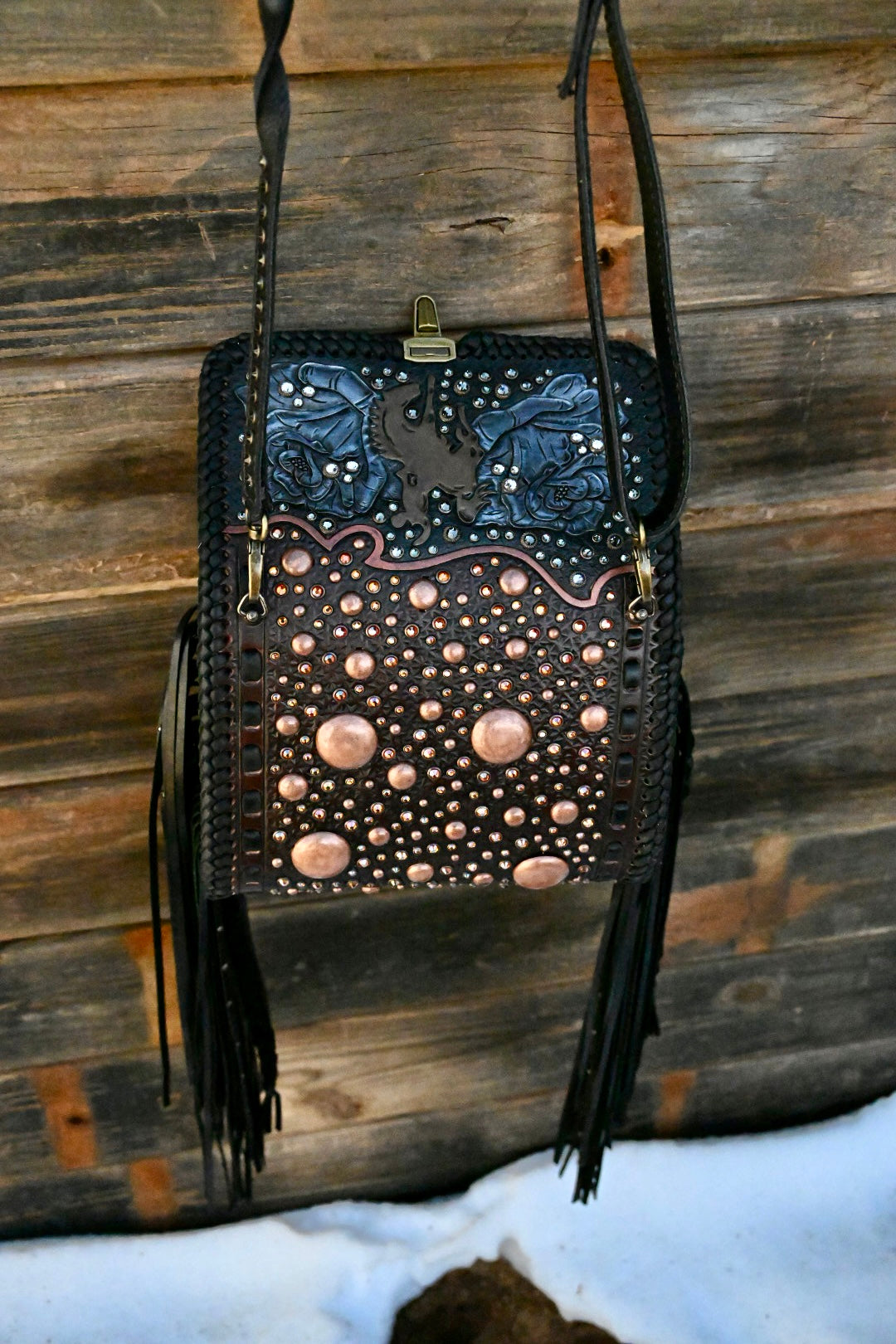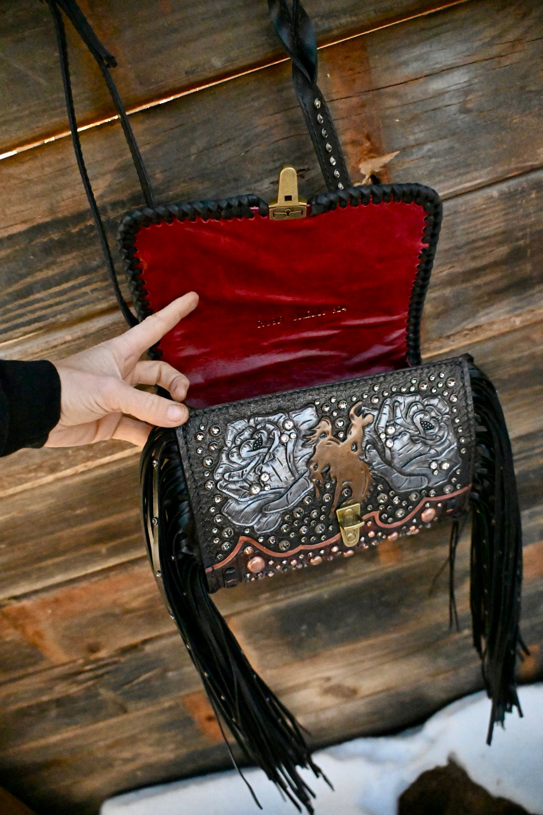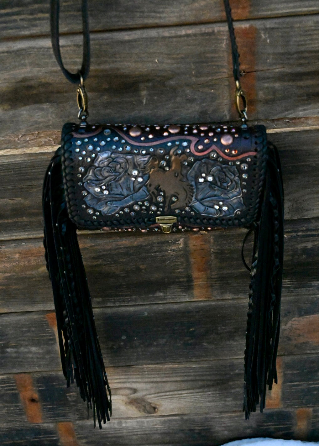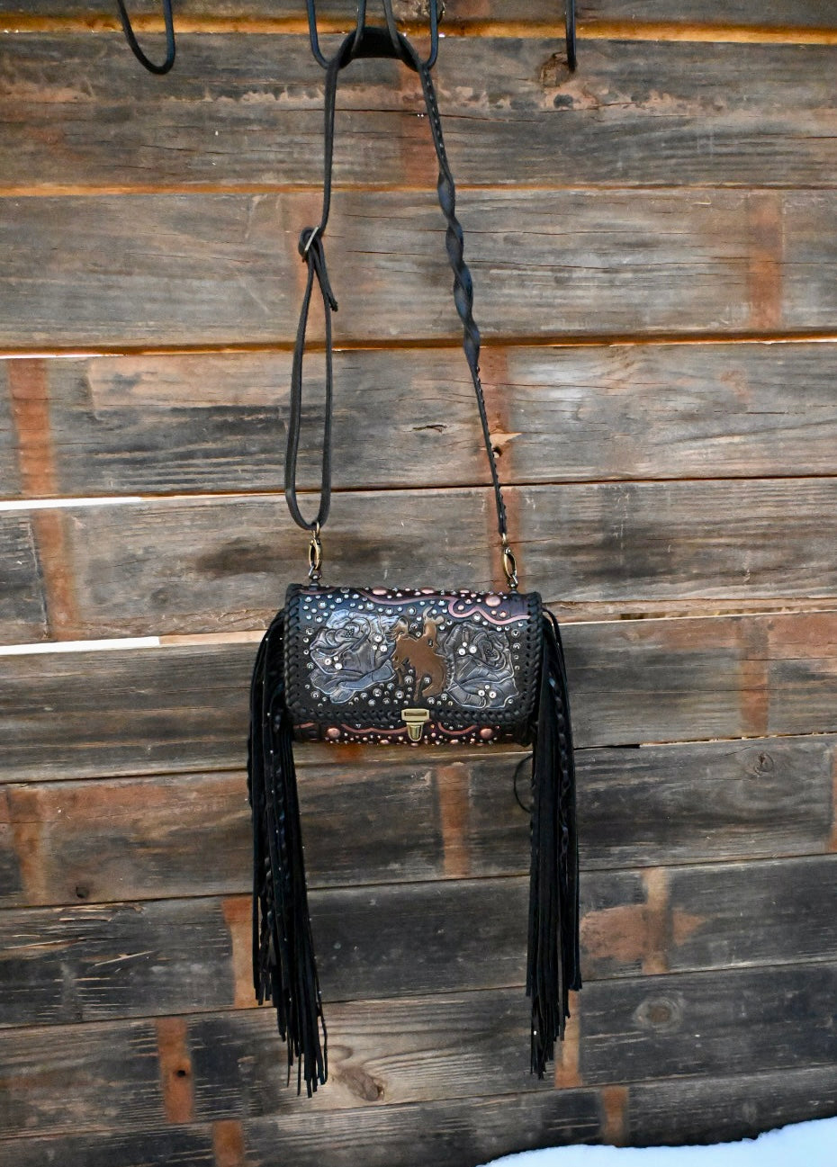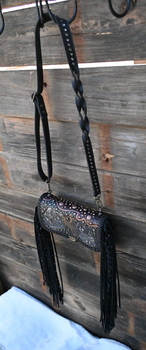 This bag measures approximately 9.5”x3.5”x7” and comes with a removable crossbody strap. The interior is leather lined and has one large leather pocket. This bag has 16” textured and rhinestone fringe