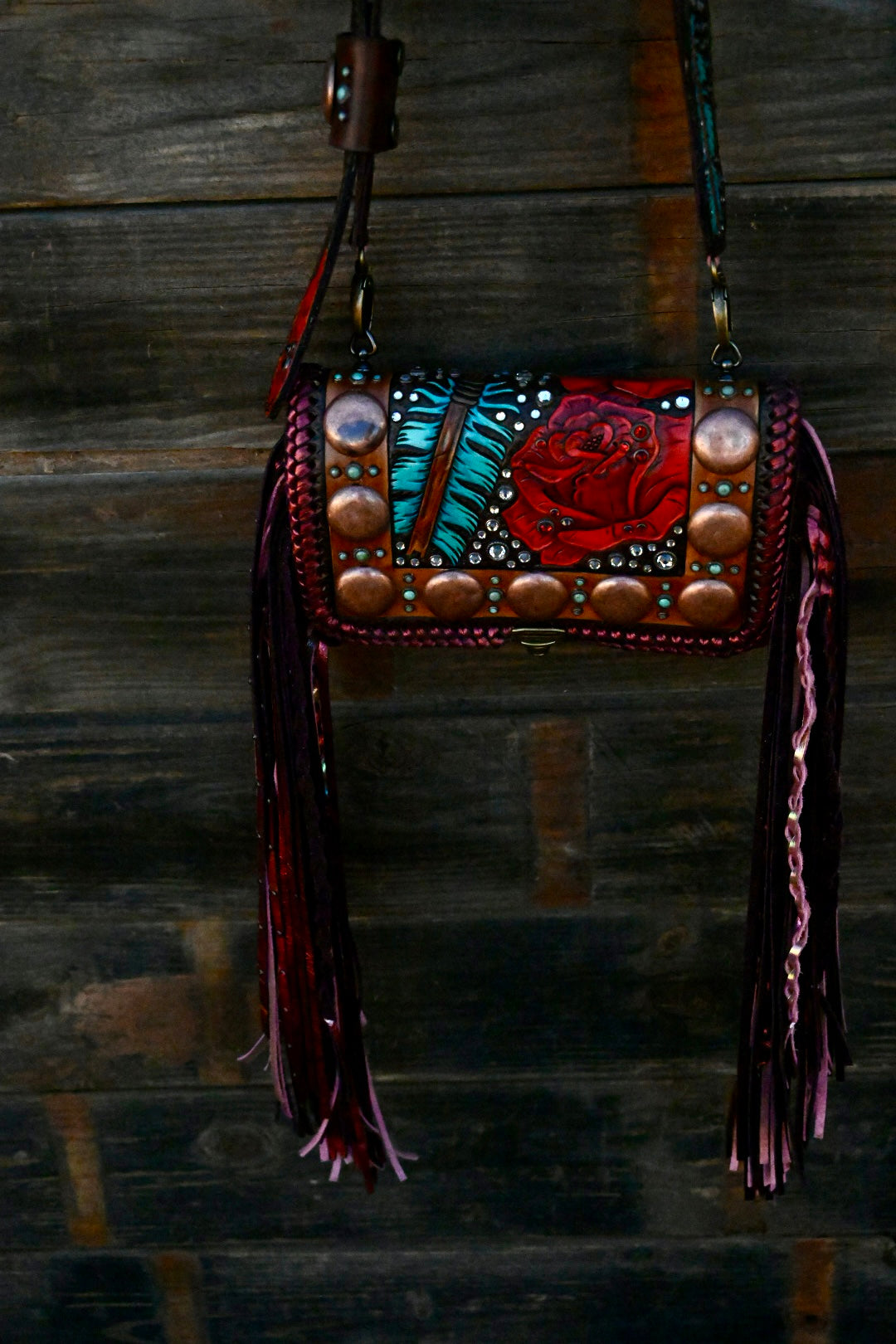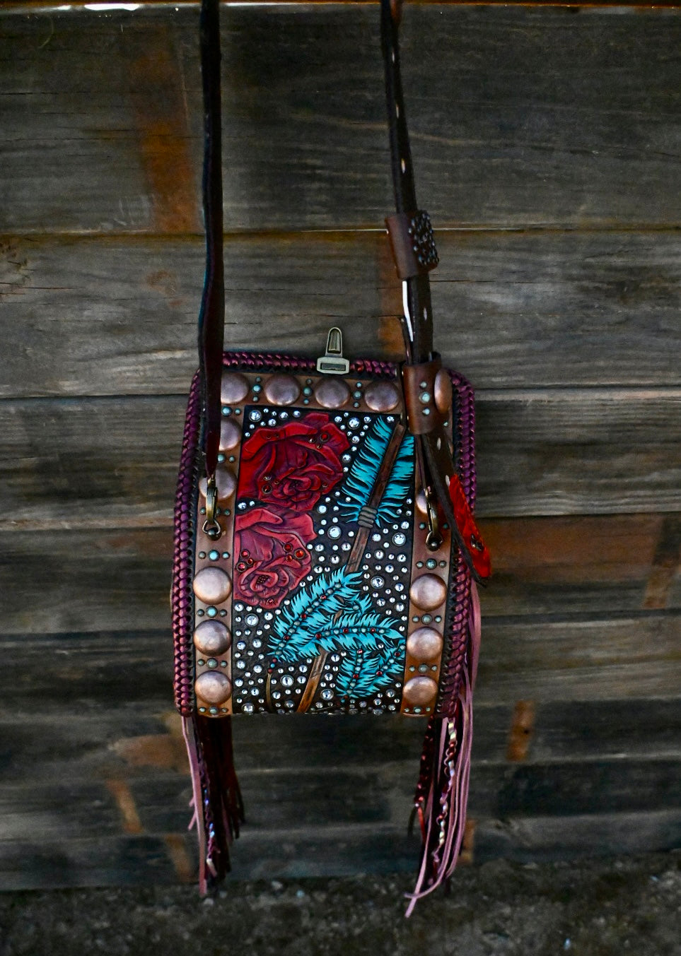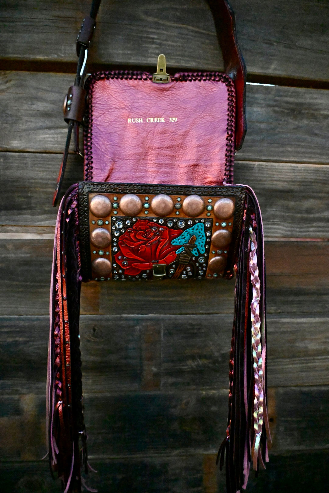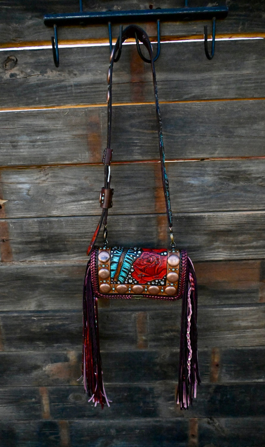 This gorgeous bag is leather lined and has 3 interior pockets and a lock clasp. Measures approximately 9”x3.5”x6 and comes with a Blevins strap. She has 16” double fringe that has texture and rhinestone!!