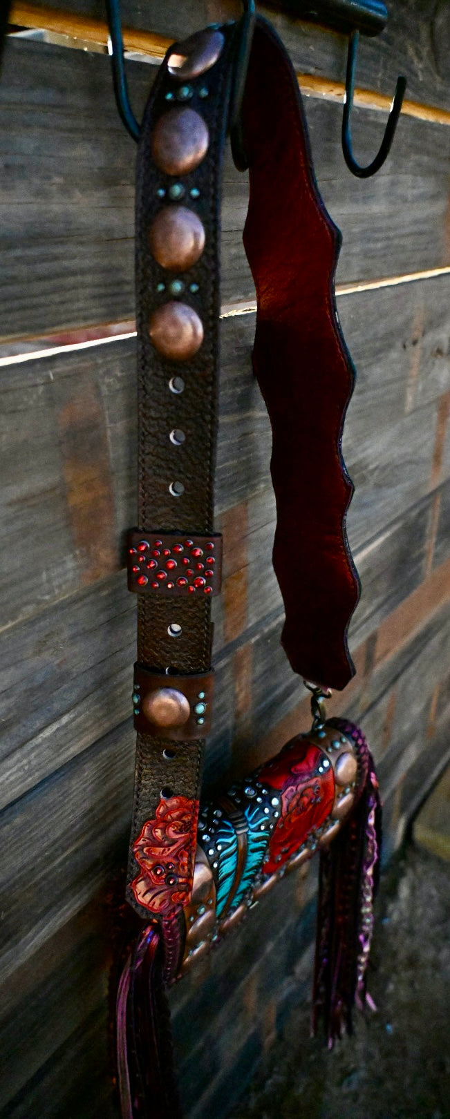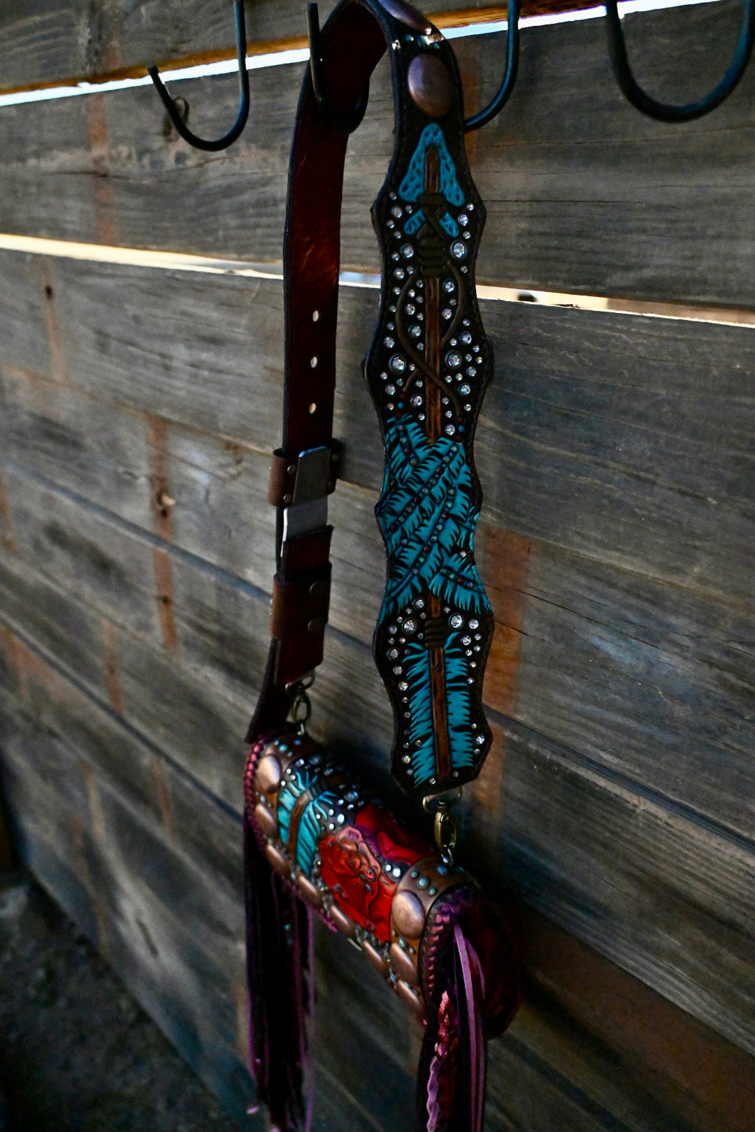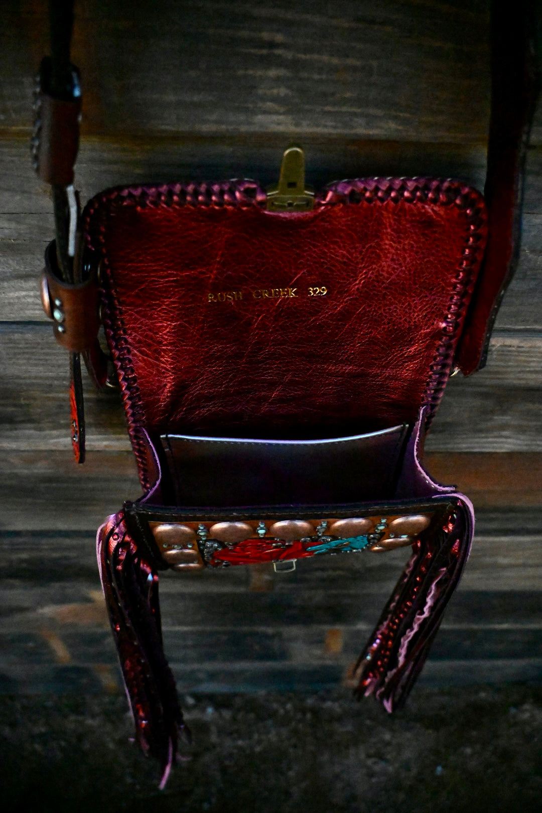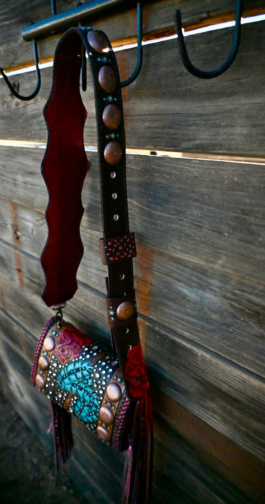This gorgeous bag is leather lined and has 3 interior pockets and a lock clasp. Measures approximately 9”x3.5”x6 and comes with a Blevins strap. She has 16” double fringe that has texture and rhinestone!!