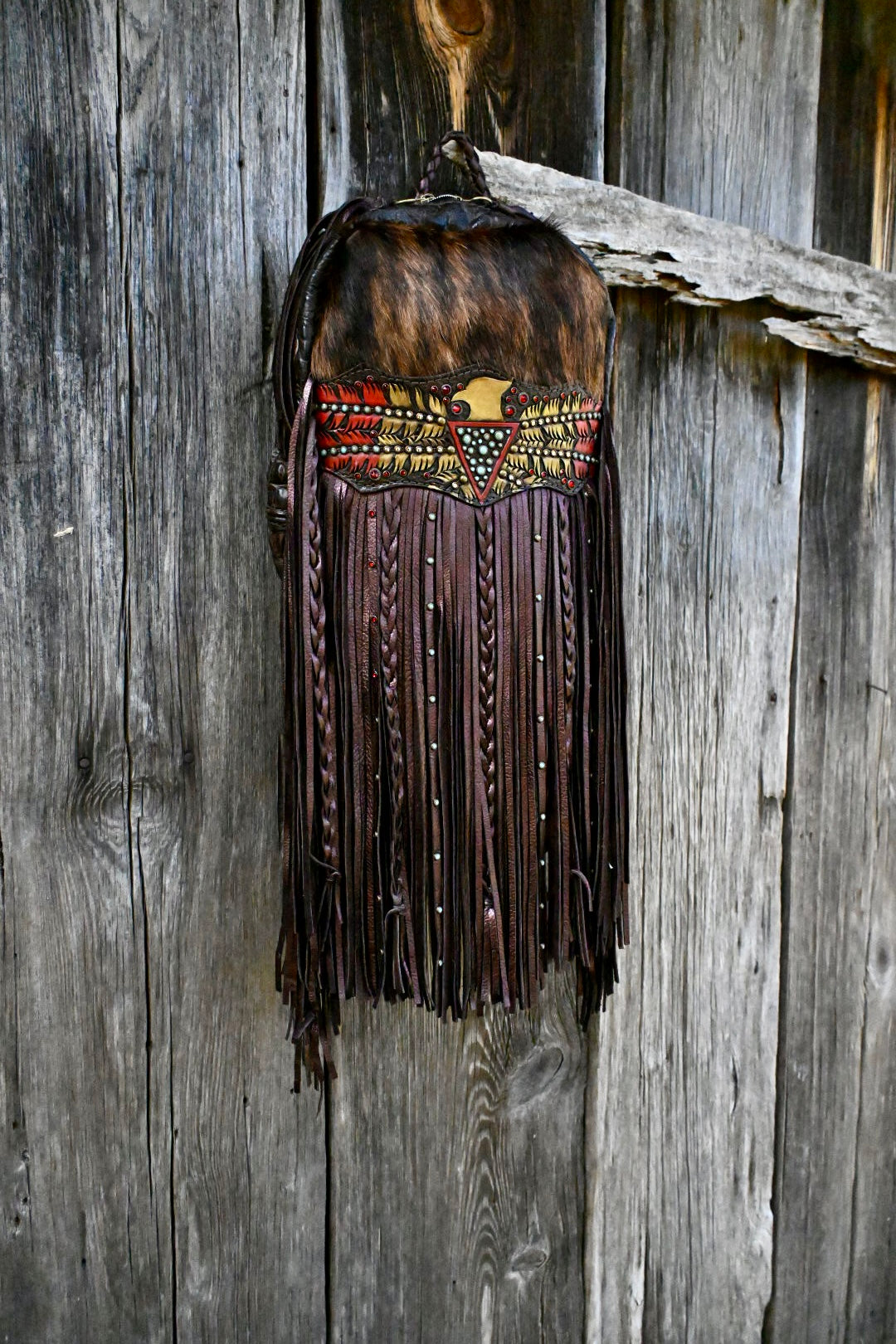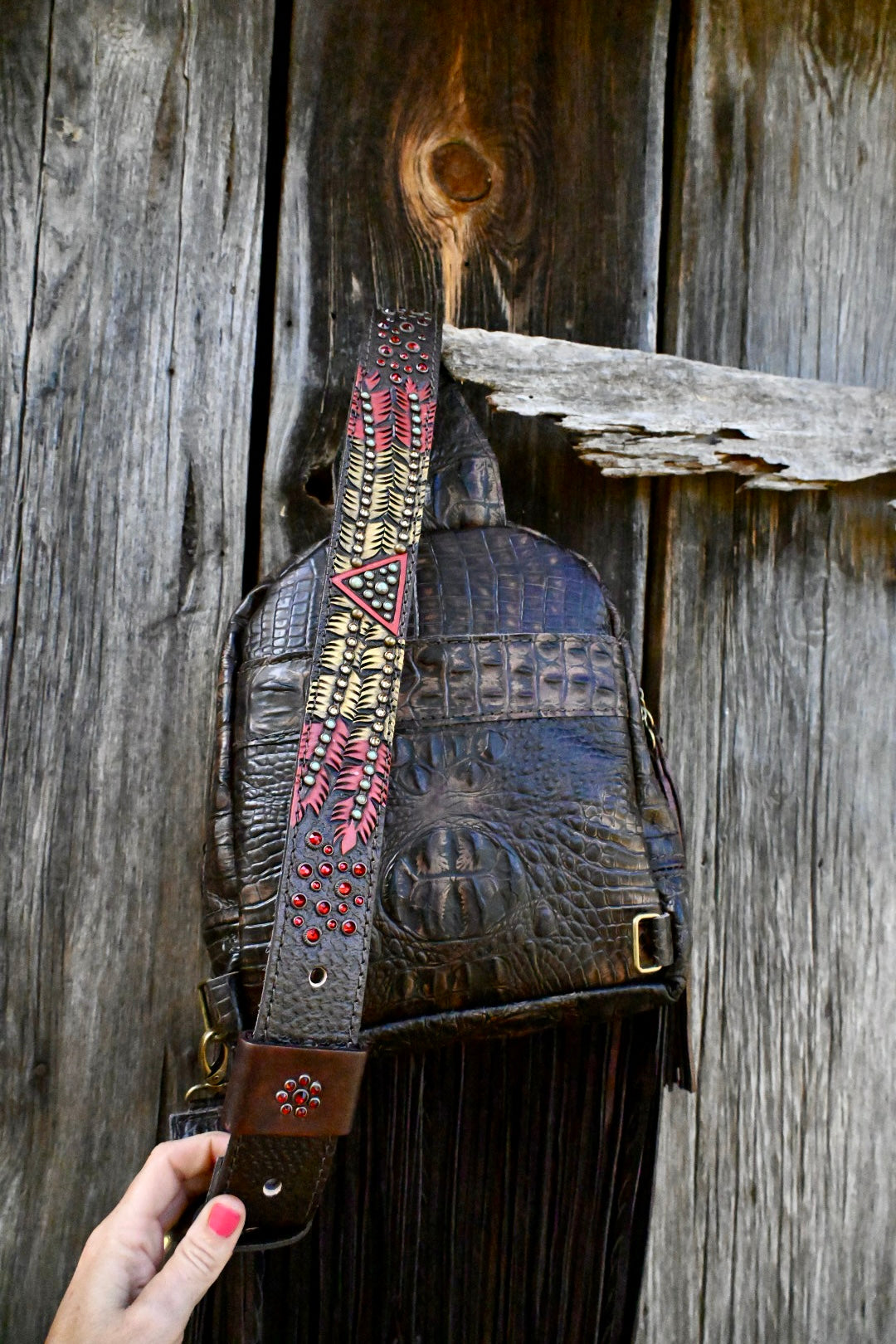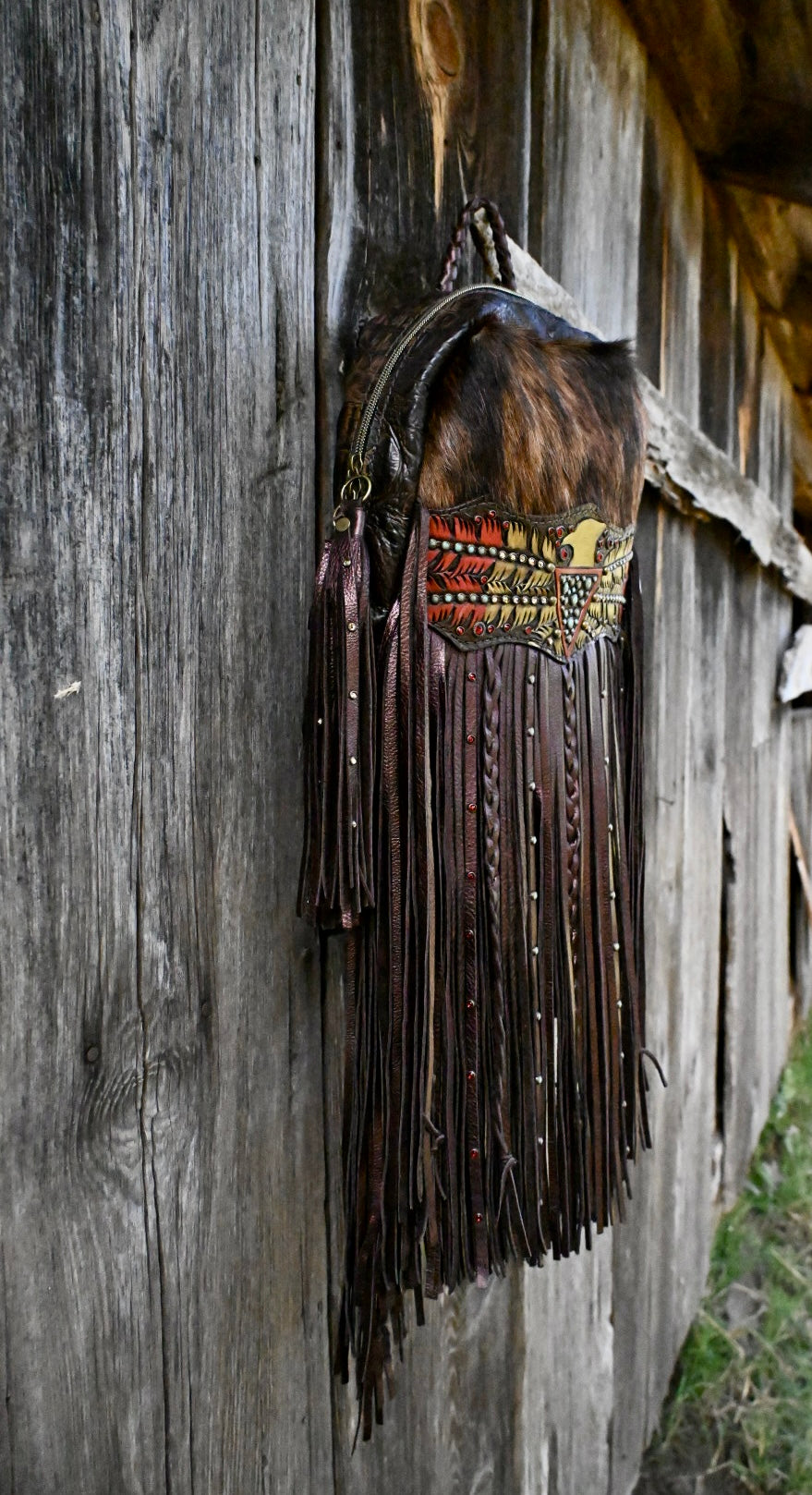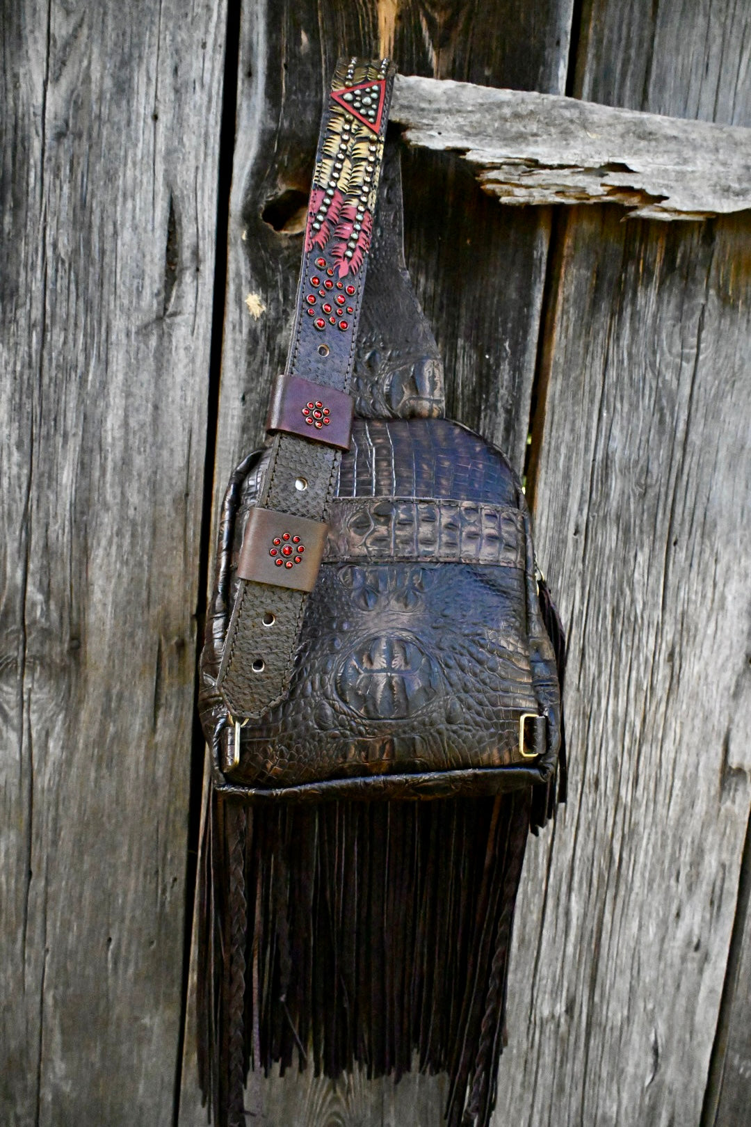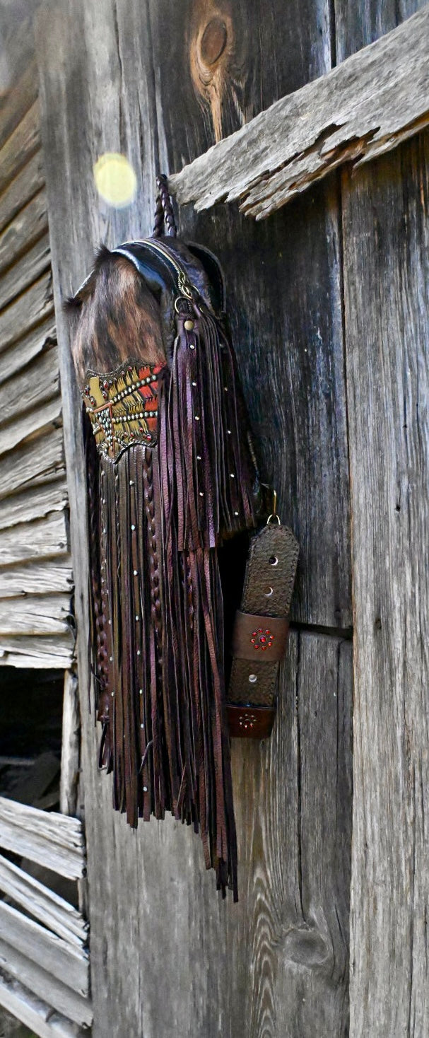 The perfect bag for women on the go!! She measures 12”x9.5”x3” and comes with 20” texture and rhinestone fringe. The adjustable strap can be attached to the left or right side of the bag too!! There is a magnetic pocket on the back and the interior has 2 pockets as well, one zips!