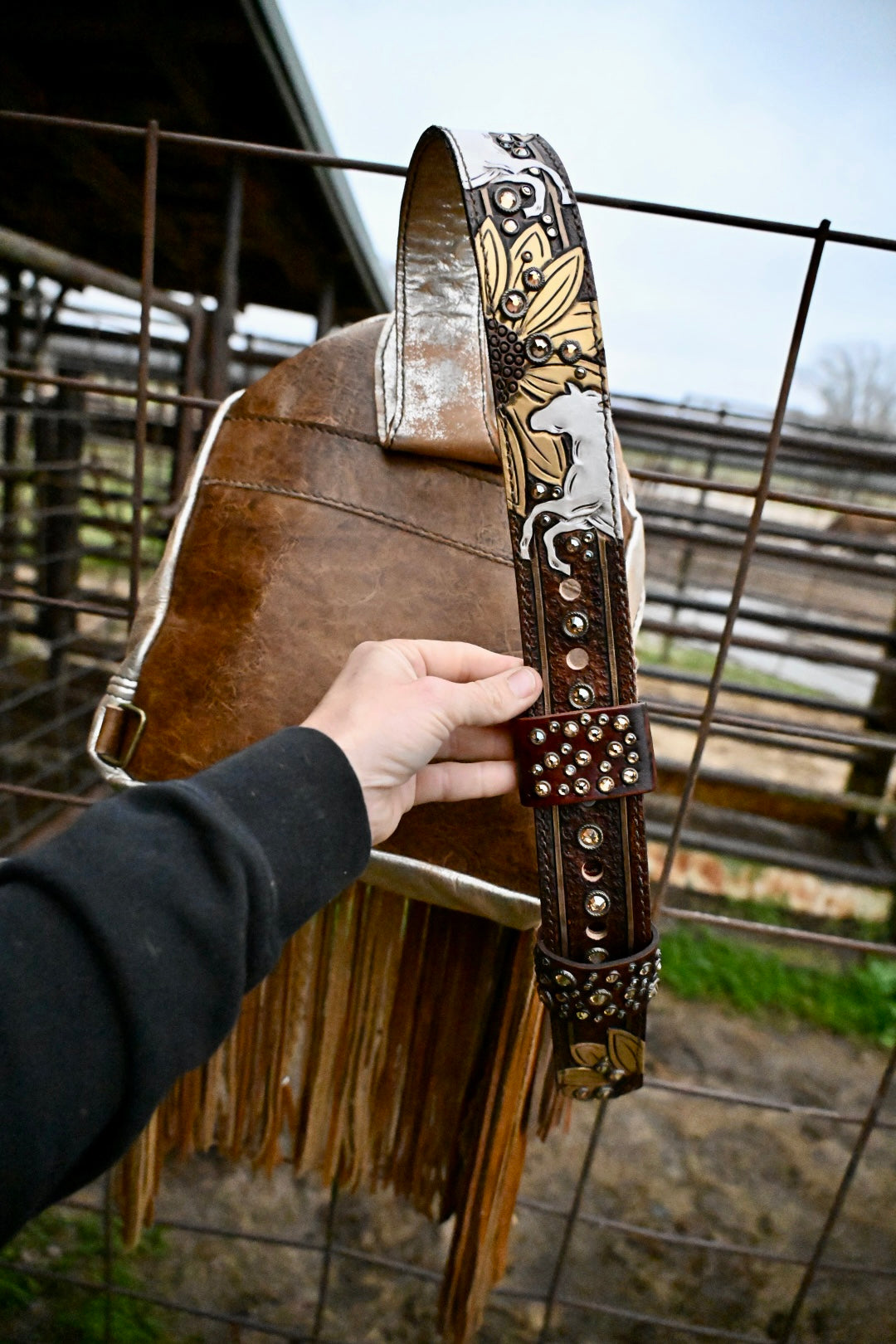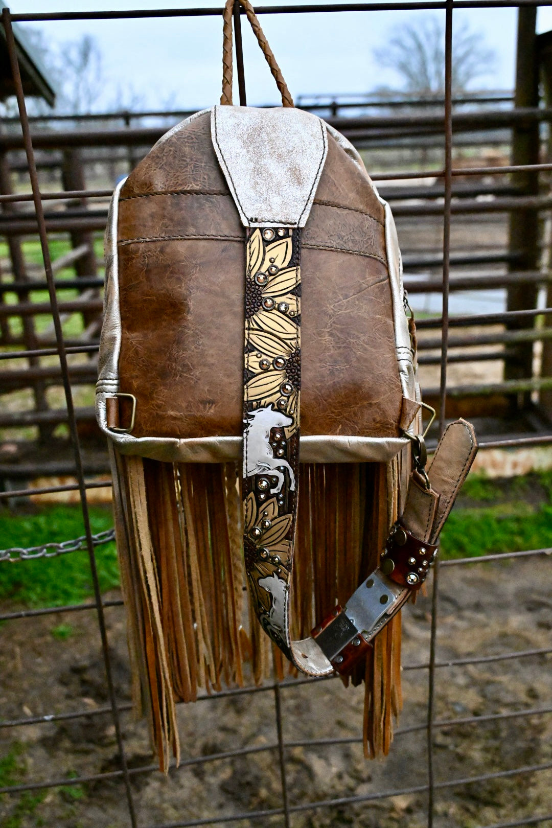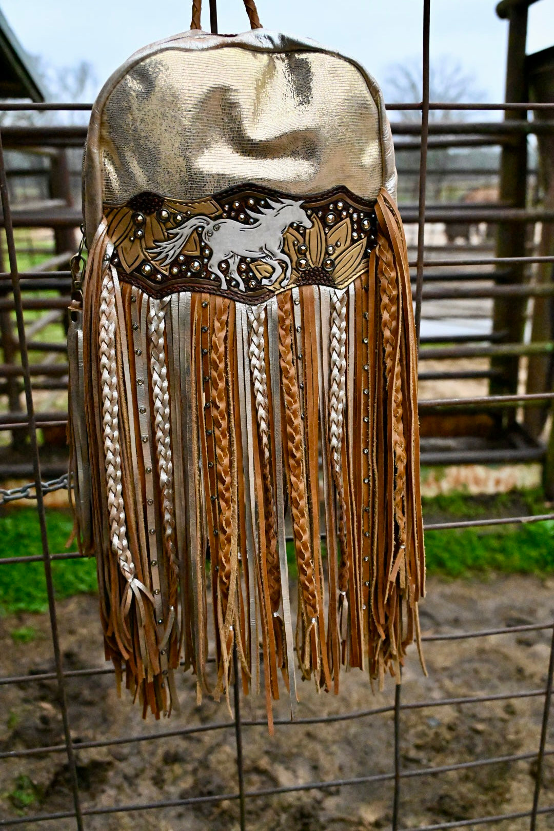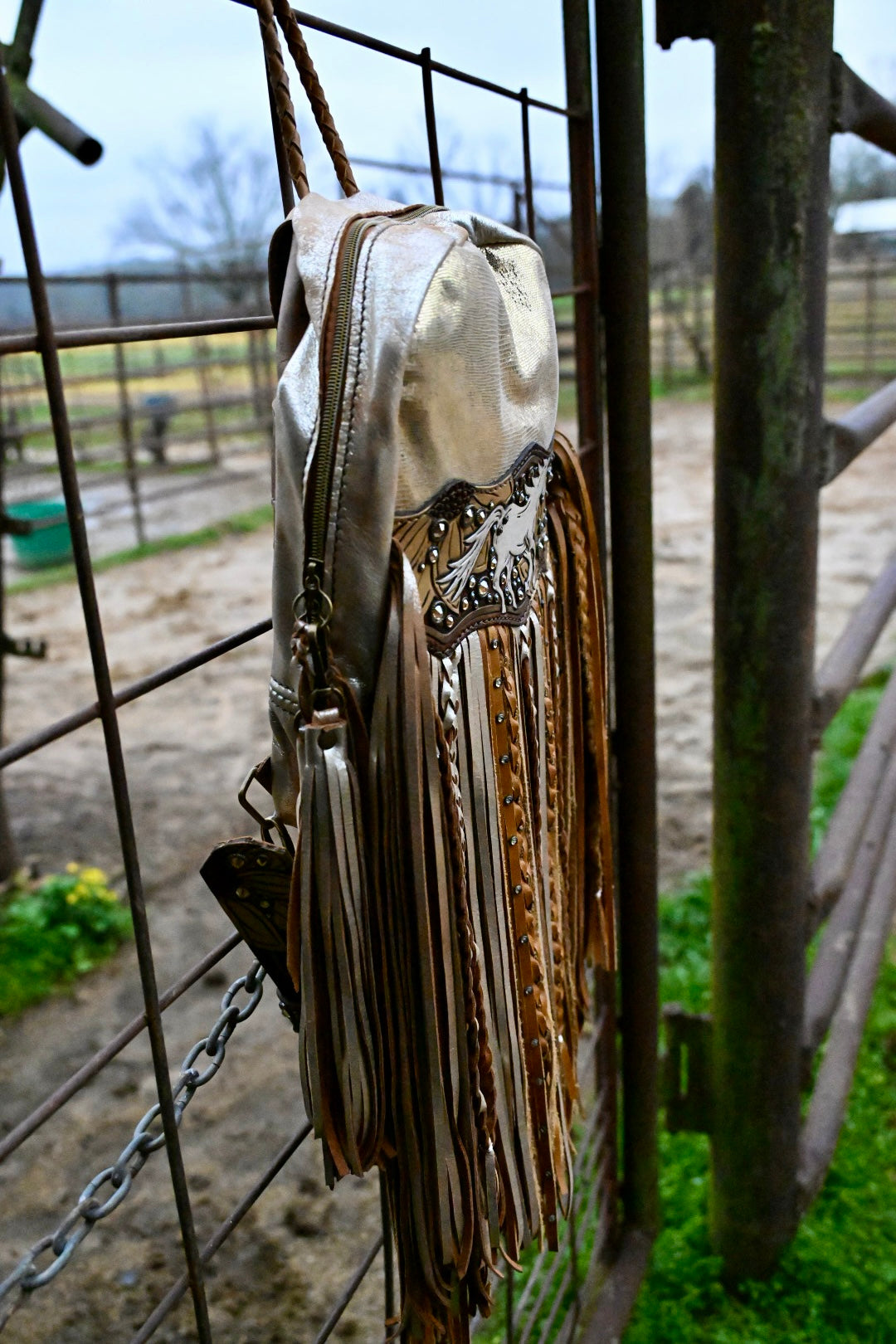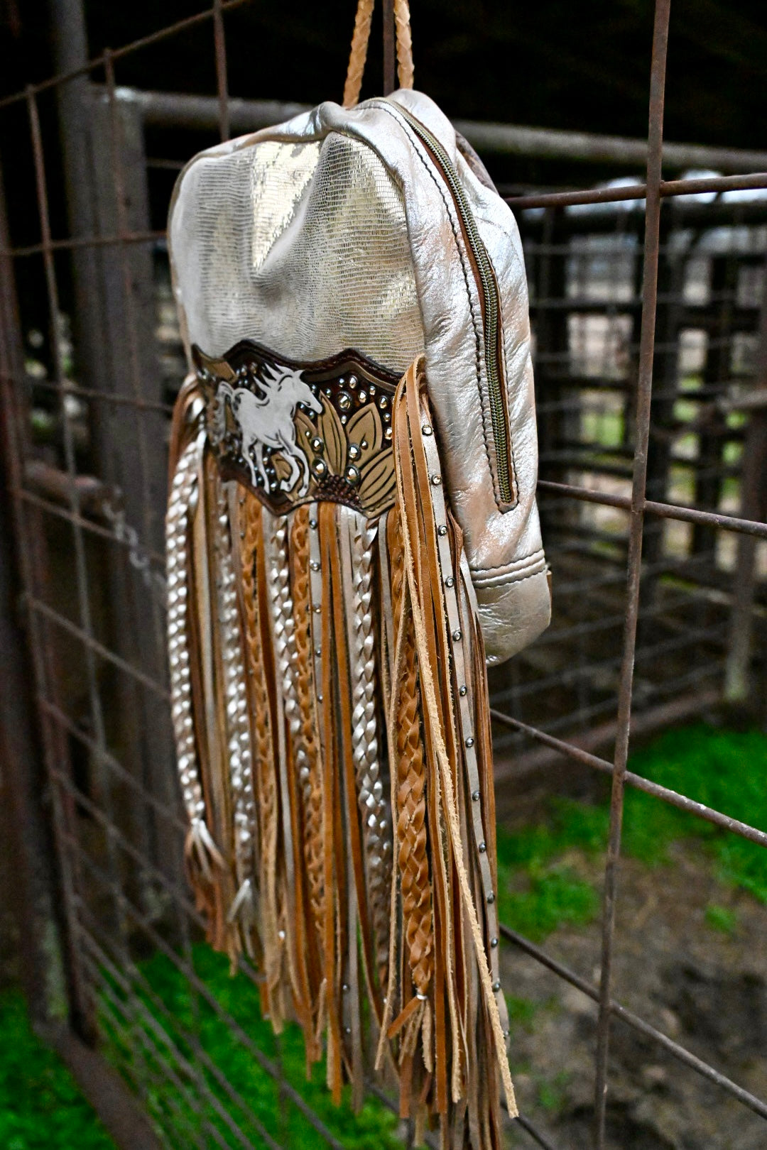 The perfect bag for women on the go!! She measures 12”x9.5”x3” and comes with 16” texture and rhinestone fringe. The adjustable strap can be attached to the left or right side of the bag too!! There is a magnetic pocket on the back and the interior has 2 pockets as well, one zips!