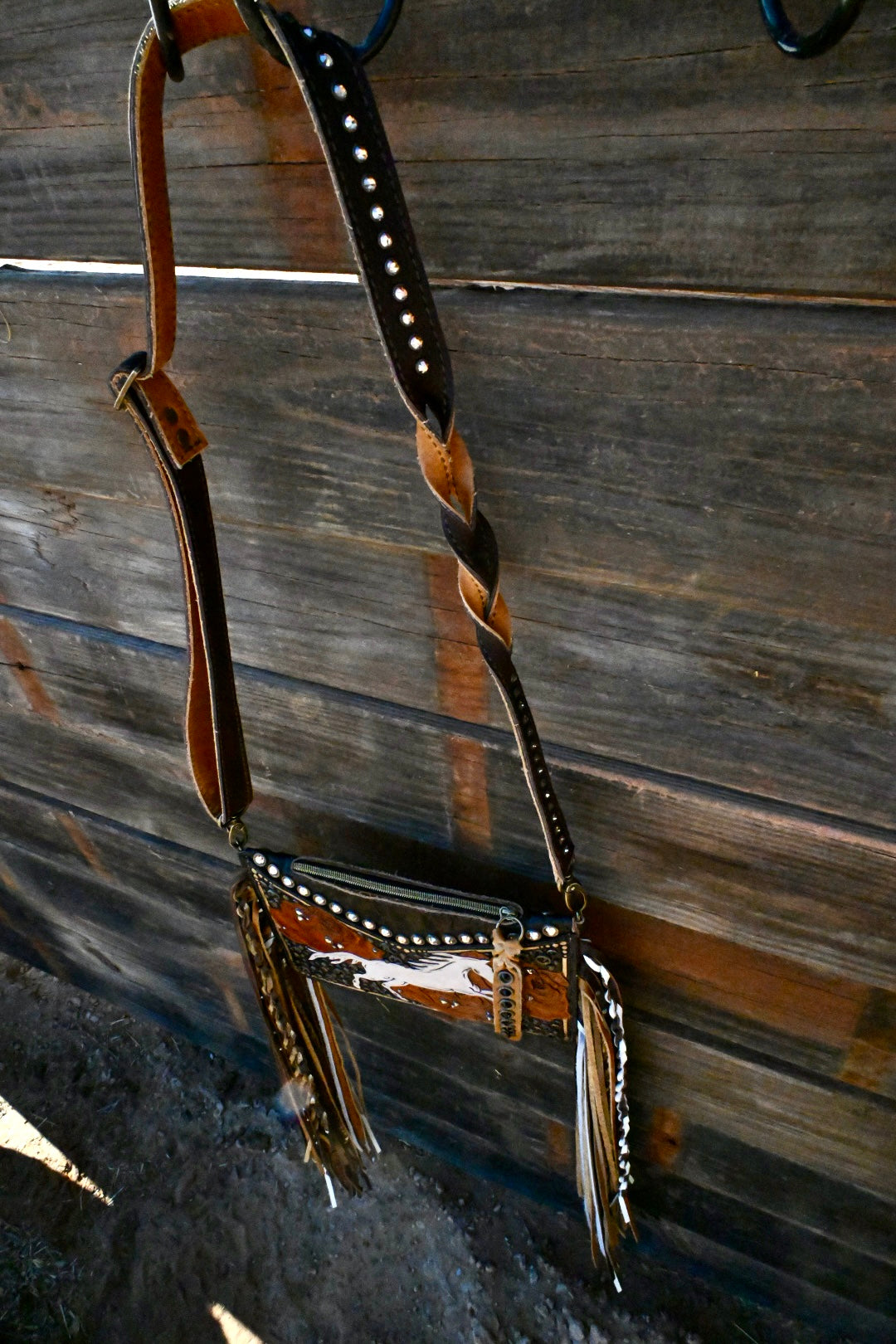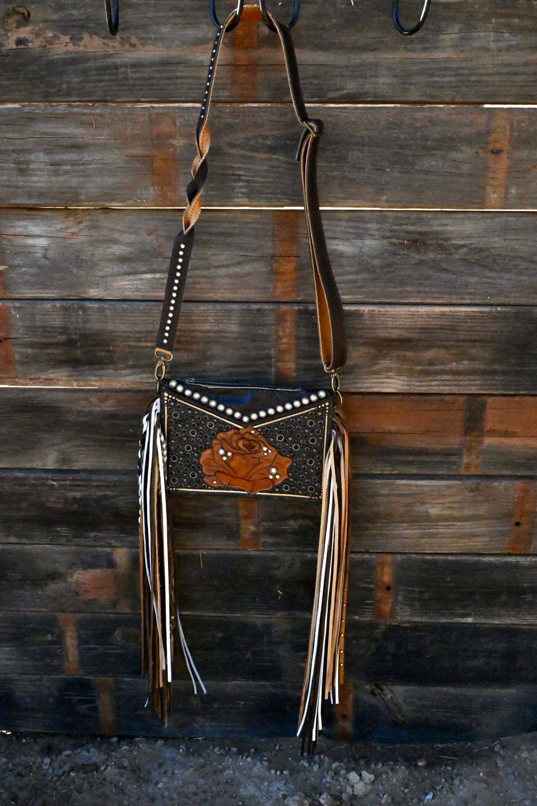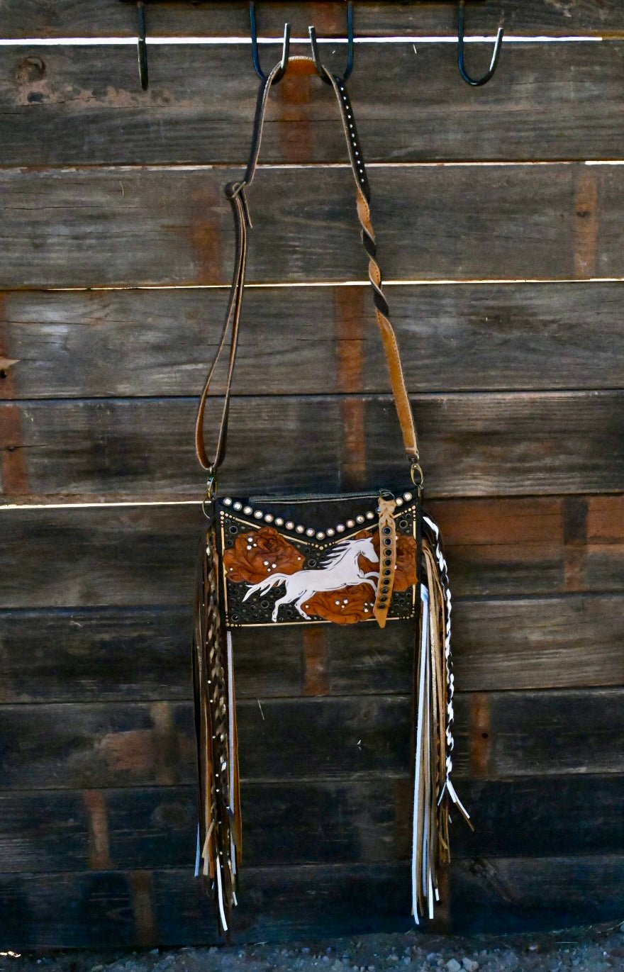 The perfect small crossbody without missing any details!! This gorgeous girl has tooled front and back leather with a zipper opening at the top. She measures 10.5”x7” and has a removable, adjustable crossbody strap. The Top Shelf has 20” textured and rhinestoned fringe