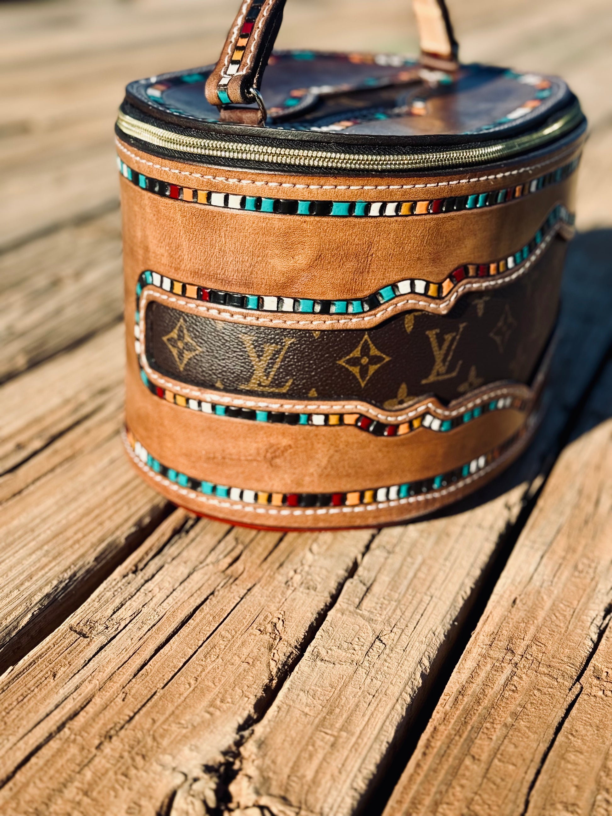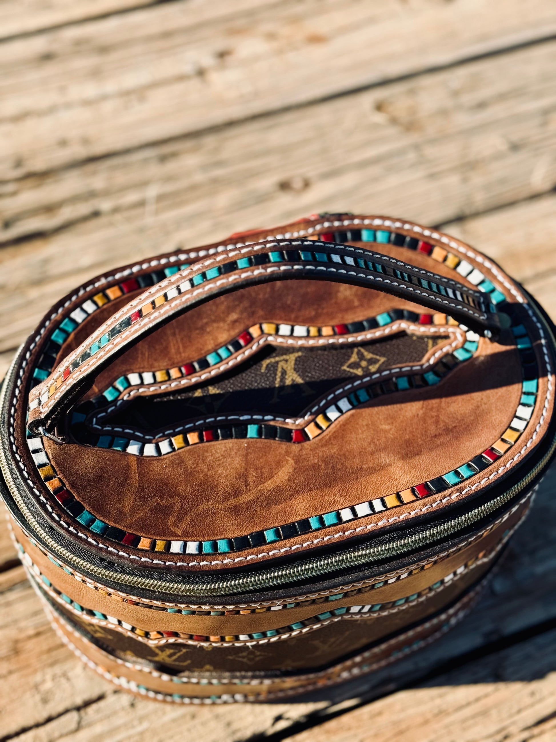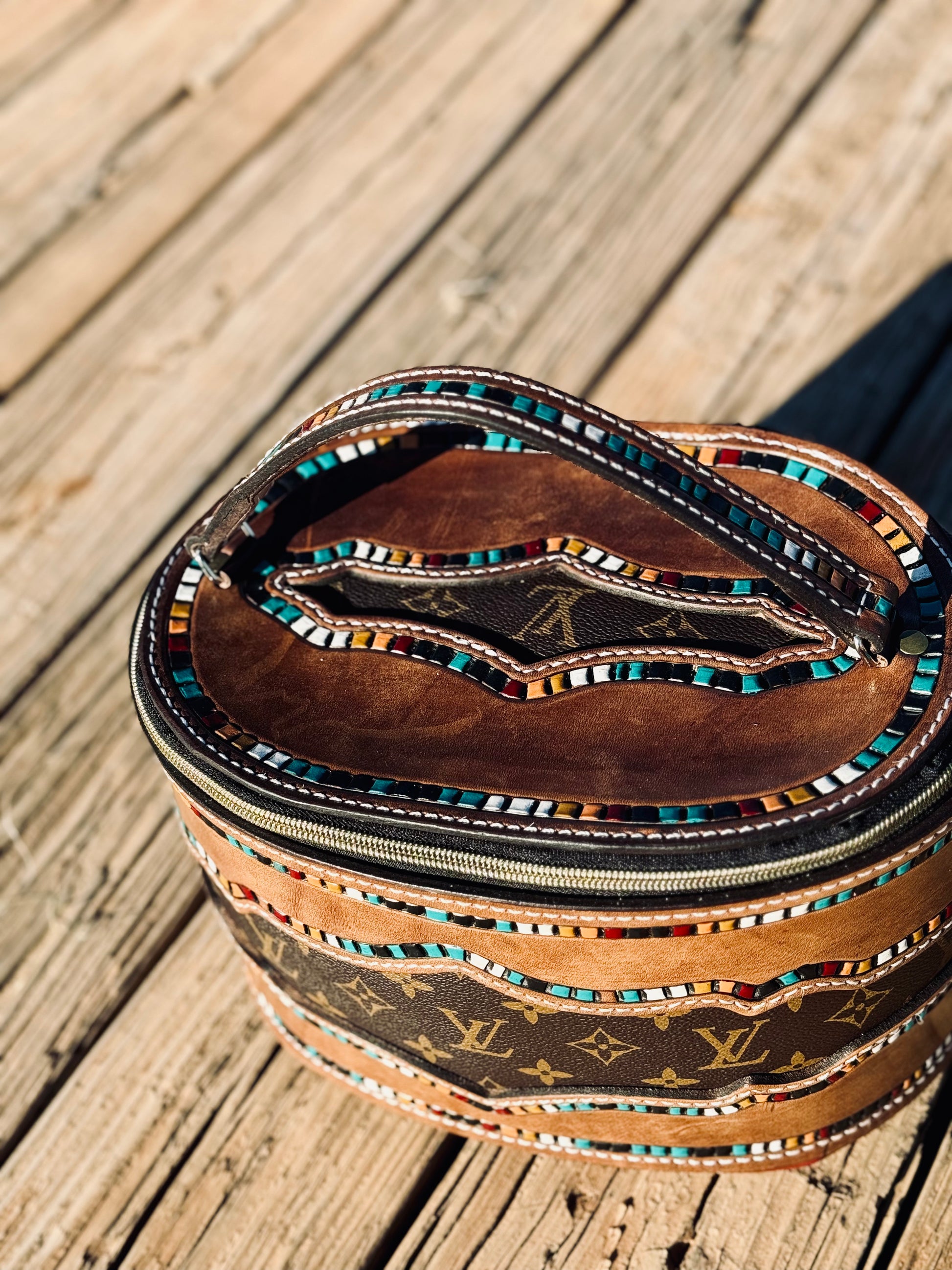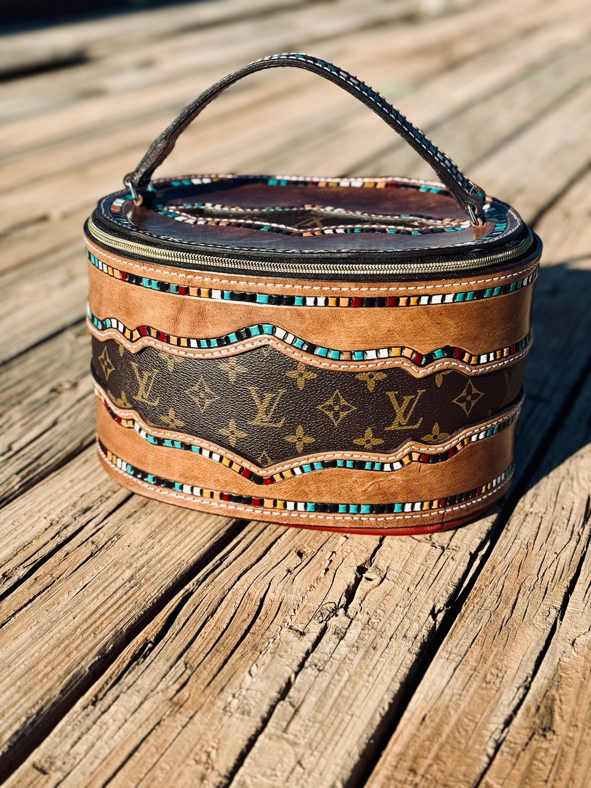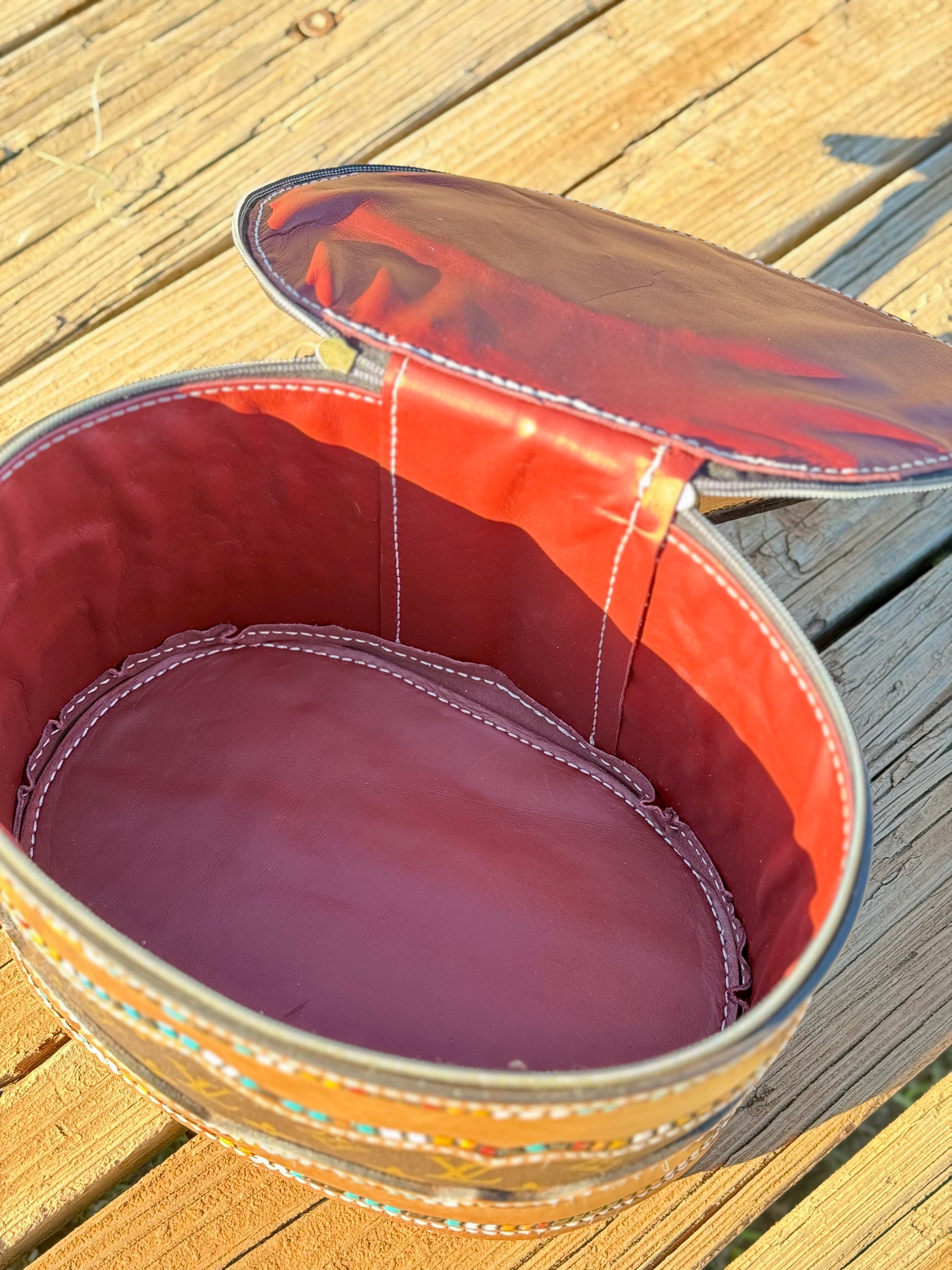 It measures approximately 11”x7”x6” and the interior is leather lined for easy clean out!