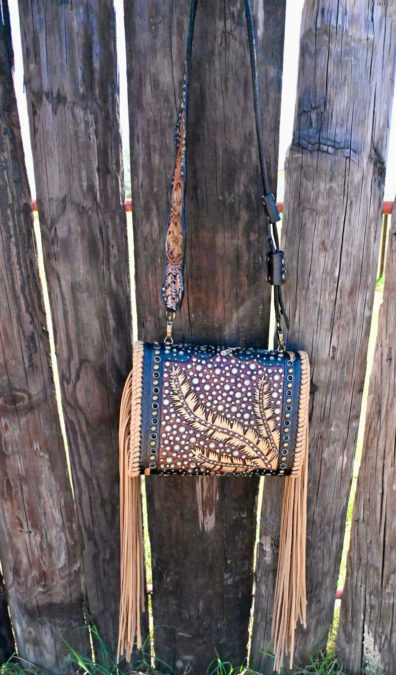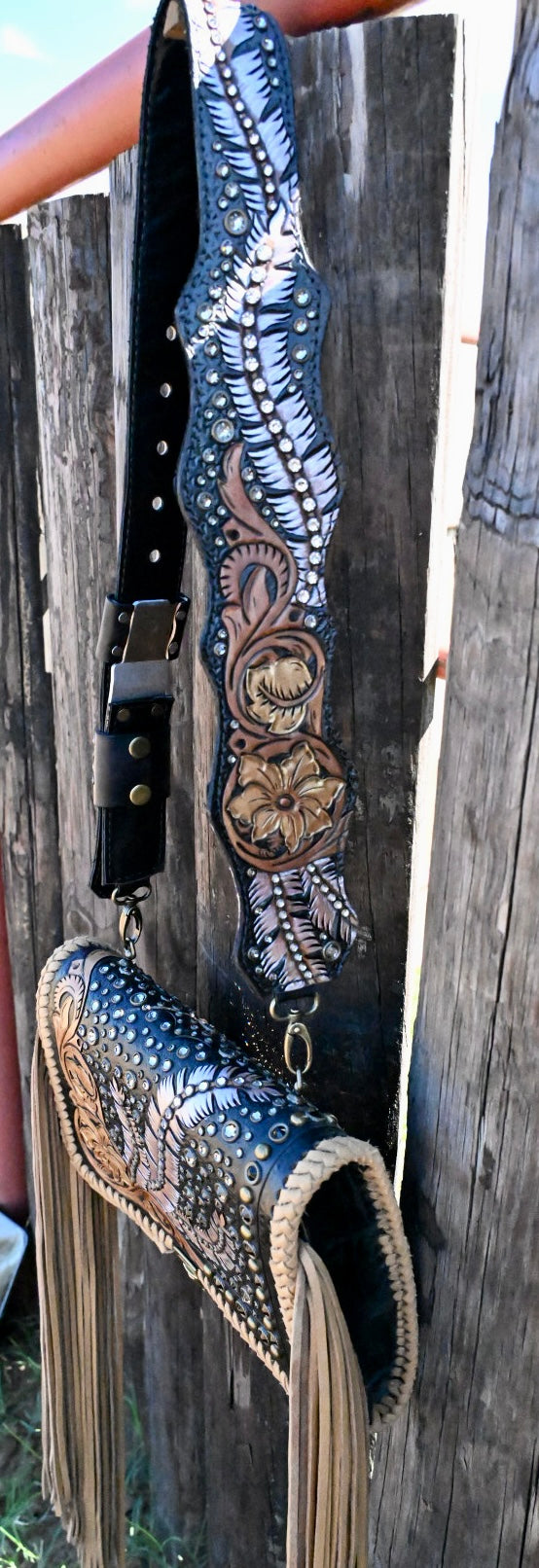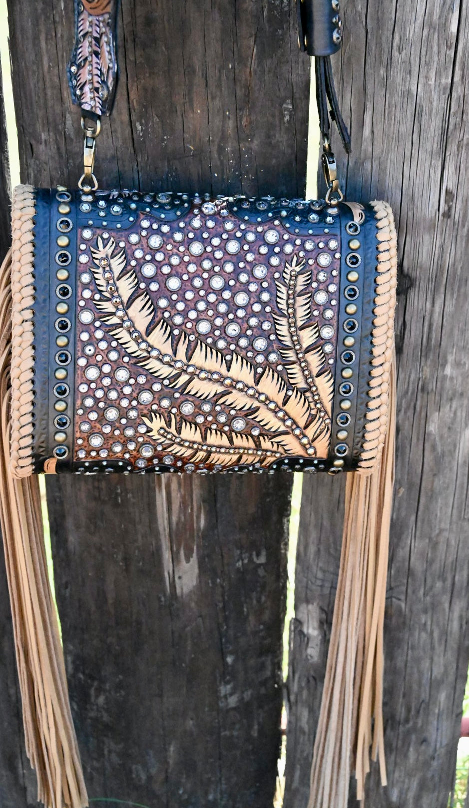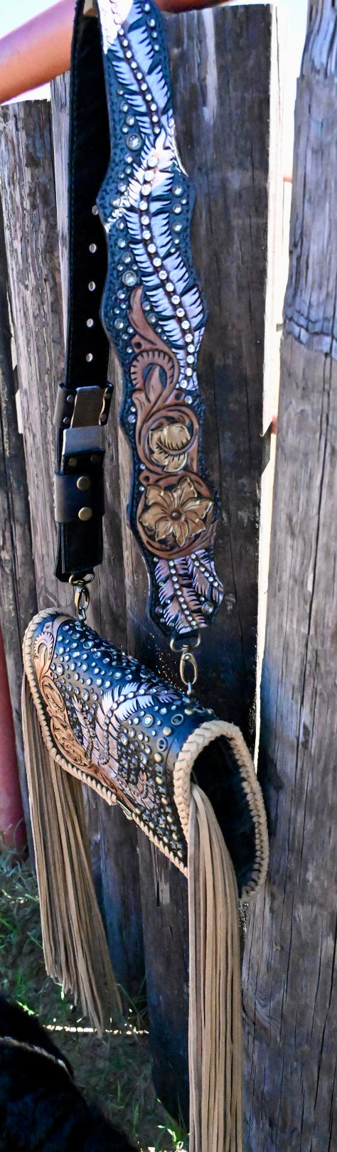This bag has a little bit of everything. It comes with a blevins strap. The bag itself measures 9.5” tall, 11.5” wide and 2.5” deep. The flap has 2 magnetic closures, the interior is leather lined and there is 3 leather pockets, one zips. It comes with 20” textured/rhinestone fringe.