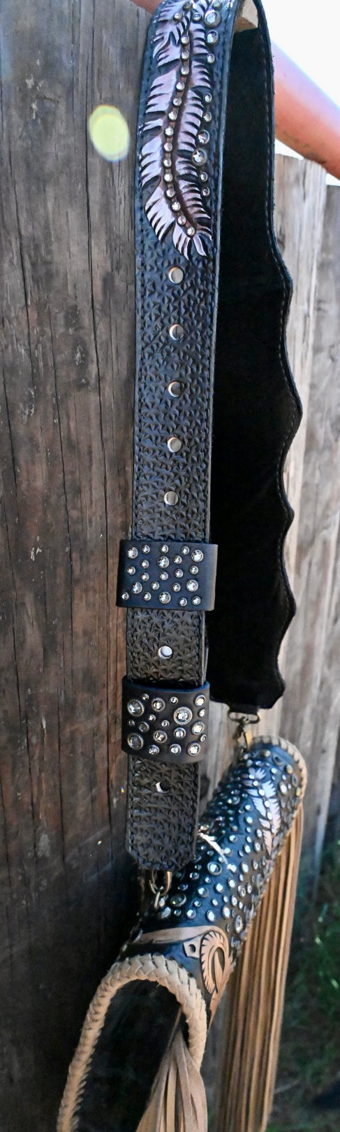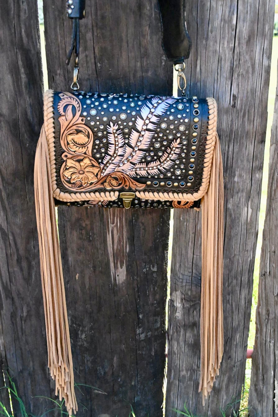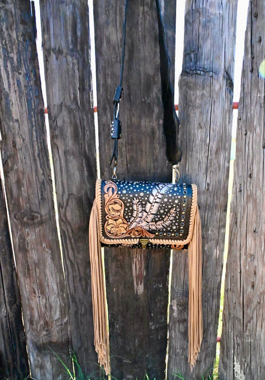 This bag has a little bit of everything. It comes with a blevins strap. The bag itself measures 9.5” tall, 11.5” wide and 2.5” deep. The flap has 2 magnetic closures, the interior is leather lined and there is 3 leather pockets, one zips. It comes with 20” textured/rhinestone fringe.