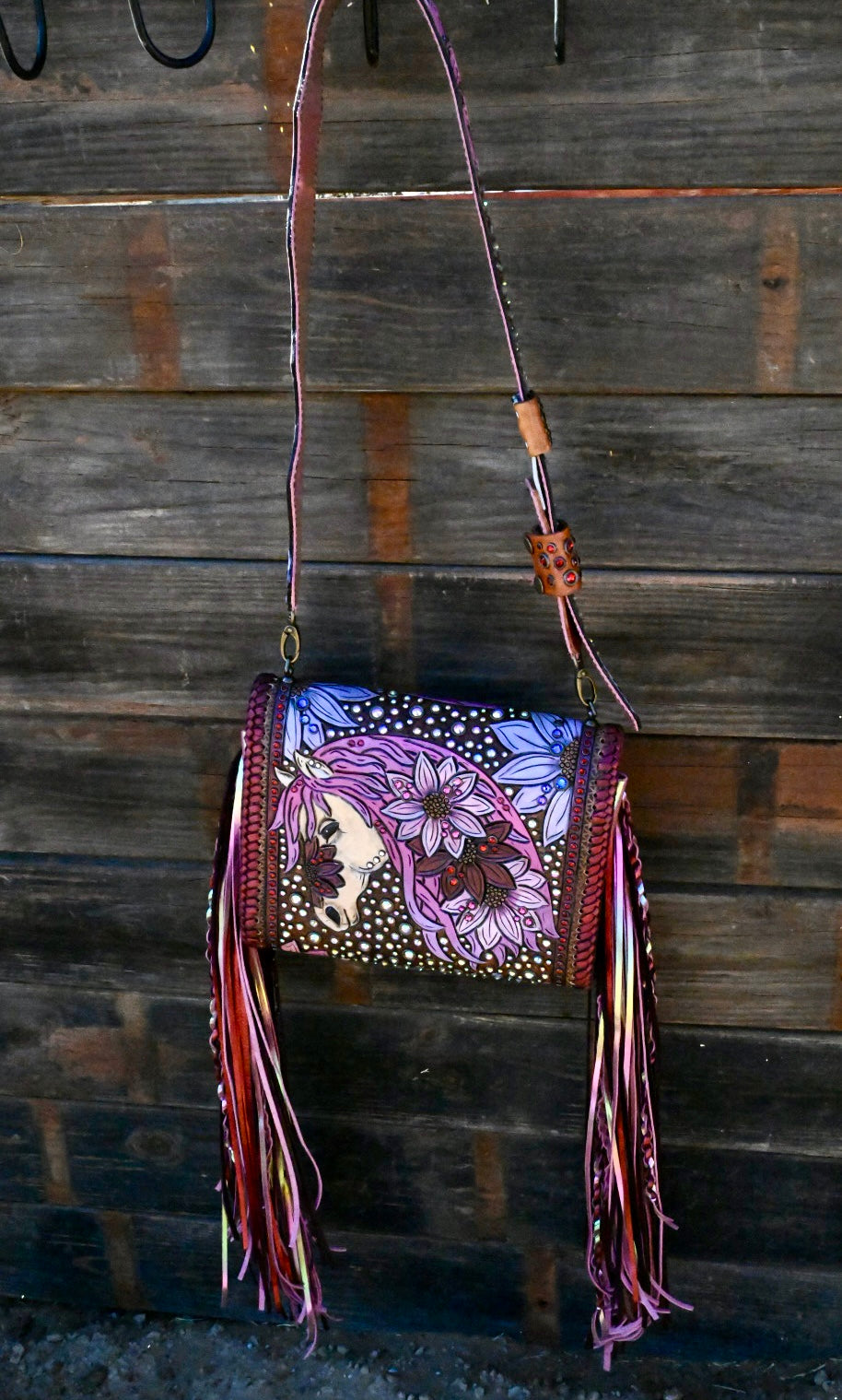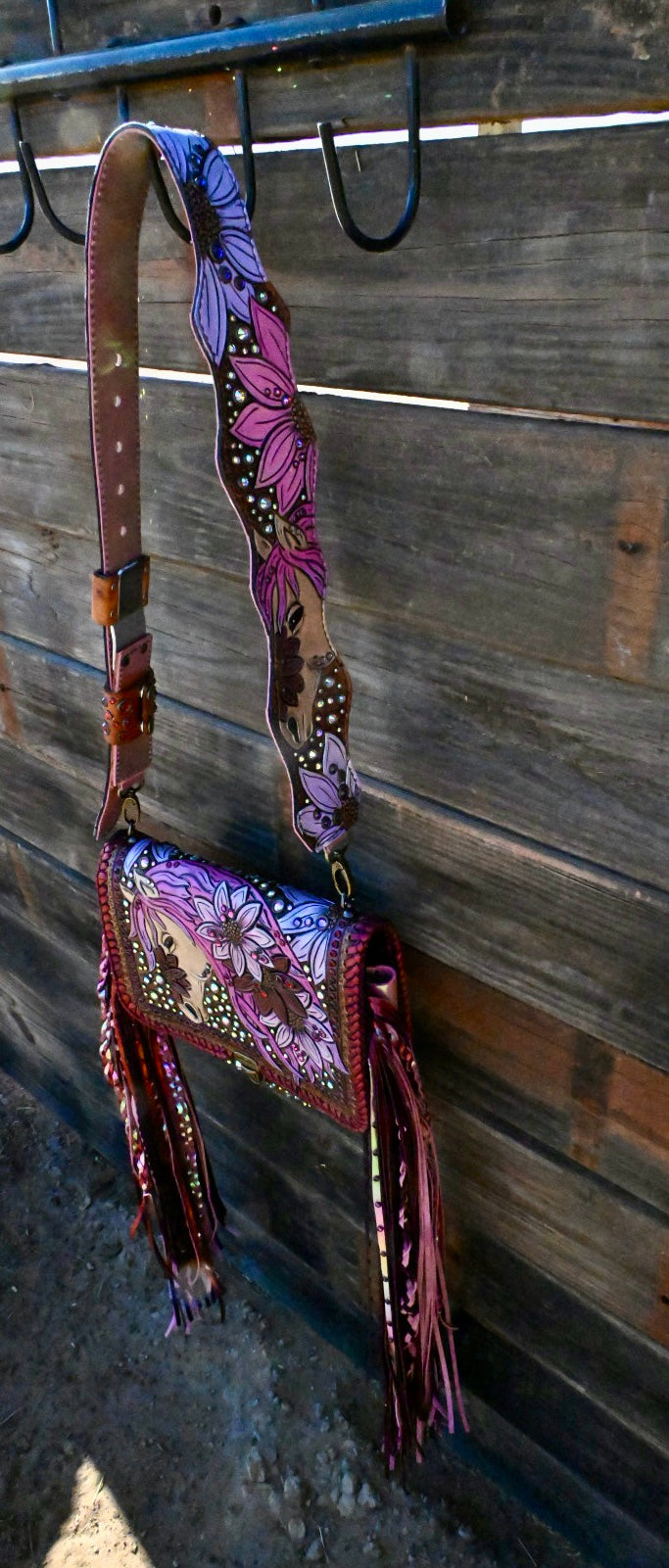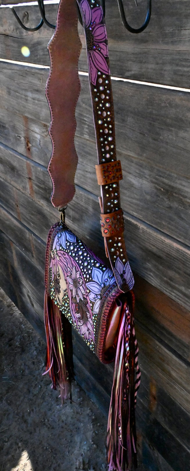 This bag has a little bit of everything. It comes with a blevins strap. The bag itself measures 9.5” tall, 11.5” wide and 2.5” deep. The flap has 2 magnetic closures, the interior is leather lined and there is 3 leather pockets, one zips. It comes with 20” textured/rhinestone fringe.