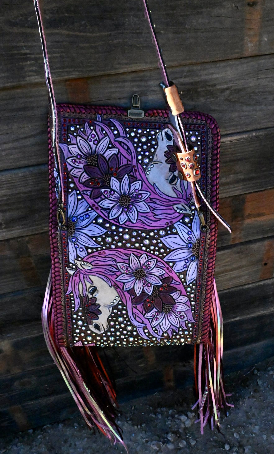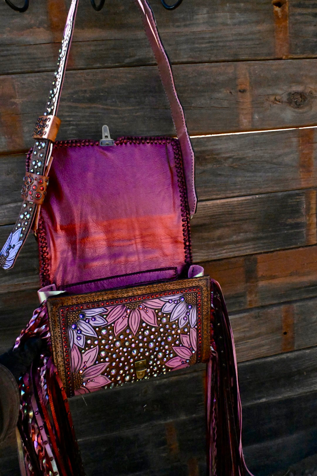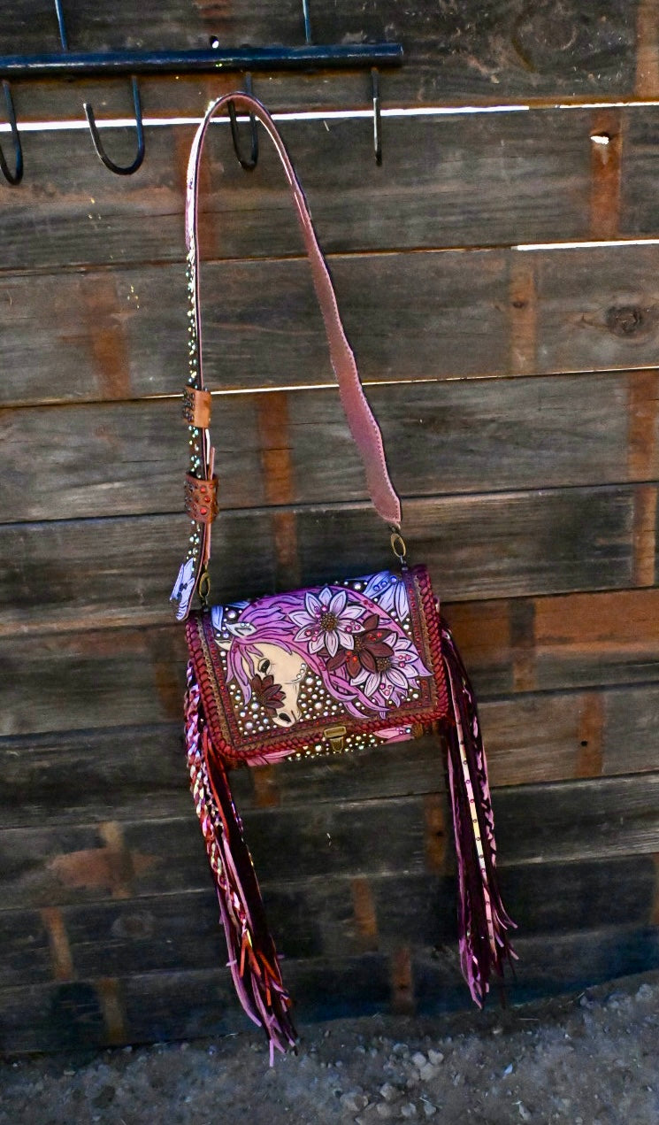 This bag has a little bit of everything. It comes with a blevins strap. The bag itself measures 9.5” tall, 11.5” wide and 2.5” deep. The flap has 2 magnetic closures, the interior is leather lined and there is 3 leather pockets, one zips. It comes with 20” textured/rhinestone fringe.